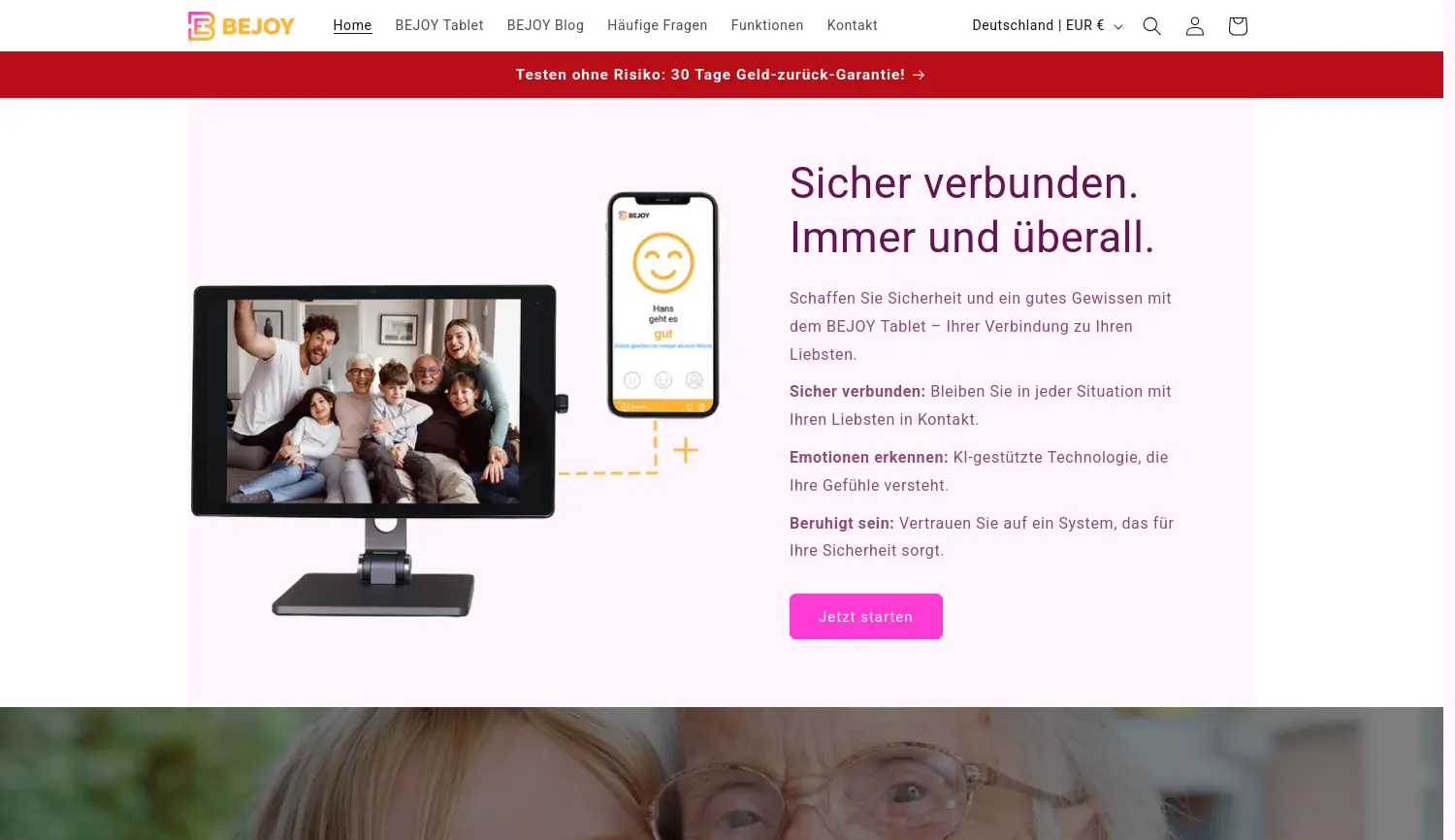 Sicher verbunden. Immer und überall. BEJOY bietet ein intelligentes Tablet mit KI-Emotionserkennung, um Senioren sicher mit ihrer Familie zu verbinden und deren Wohlbefinden zu überwachen.