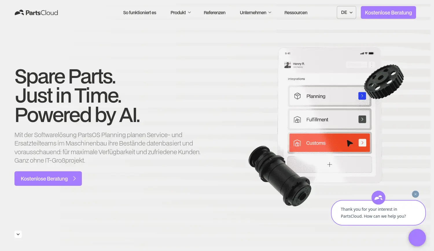 Ersatzteile. Just in Time. Angetrieben durch KI. PartsCloud bietet mittelständischen Maschinenbauern die KI-gestützte Softwarelösung PartsOS Planning zur datenbasierten Optimierung ihrer Ersatzteilbestände und Nachfrageprognosen.