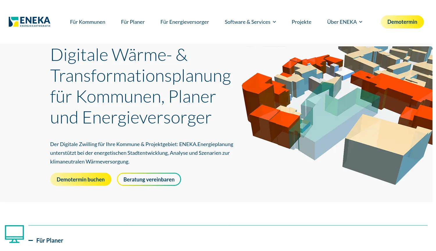 Digitale Wärme- & Transformationsplanung für die Klimaneutralität. ENEKA bietet Kommunen, Planern und Energieversorgern mit der Software ENEKA.Energieplanung einen Digitalen Zwilling zur effizienten Wärme- und Transformationsplanung.