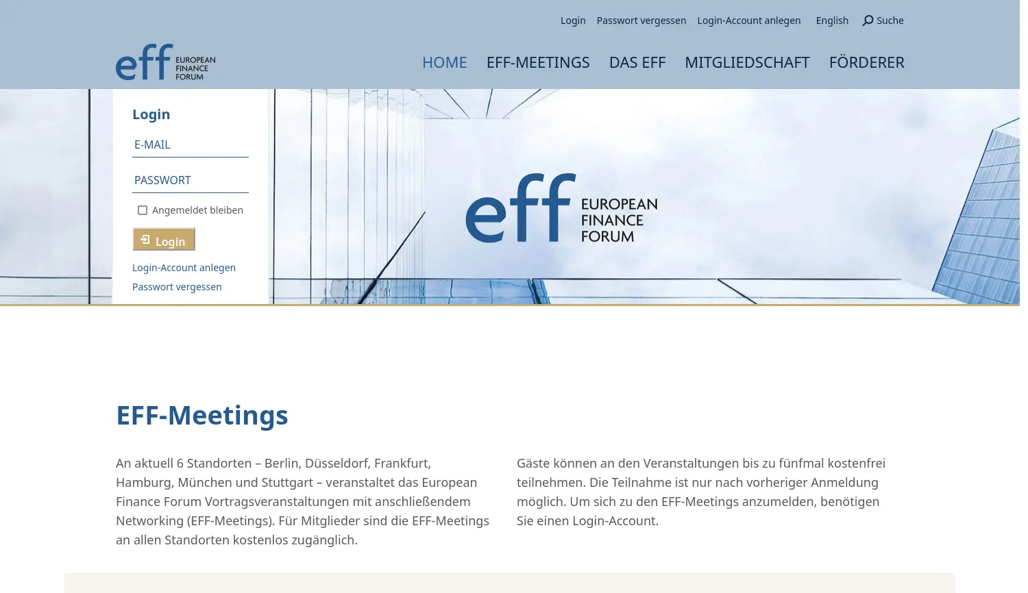 Die zentrale Plattform für den Erfahrungsaustausch im europäischen Finanzwesen. Das European Finance Forum (EFF) ist ein Netzwerk und eine Veranstaltungsplattform für Führungskräfte der Finanzdienstleistungsbranche in Deutschland.