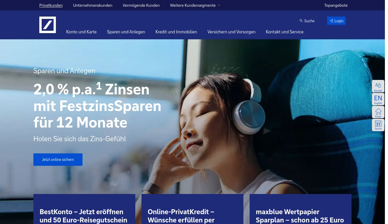 Banking, Geldanlage und Beratung – weltweit und persönlich. Die Deutsche Bank ist eine globale Finanzinstitution, die umfassende Bank-, Anlage- und Beratungsdienstleistungen für Privat-, Geschäfts- und institutionelle Kunden anbietet.