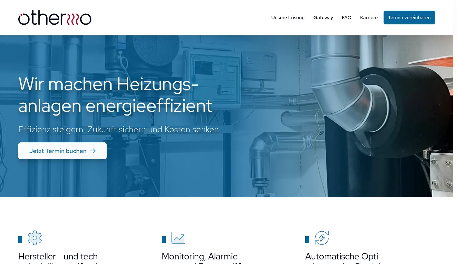 Wir machen Heizungsanlagen energieeffizient. othermo bietet eine intelligente, automatisierte SaaS-Lösung zur Optimierung des Wärmemanagements von Heizungsanlagen, um Energie und Kosten nachhaltig zu senken.