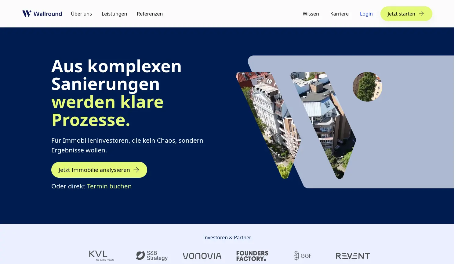 Ihre Immobilie – einfach energetisch saniert. Von der Planung bis zur Umsetzung. Wallround ist ein digitalisierter Generalunternehmer, der die energetische Sanierung von Mehrfamilienhäusern für institutionelle Investoren von der Analyse bis zur vollständigen Umsetzung verantwortet.