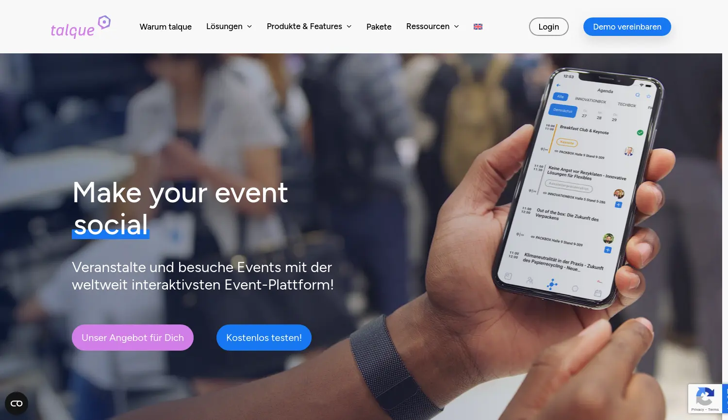 Die weltweit interaktivste Event-Plattform für Konferenzen, Messen und Festivals. Talque bietet eine interaktive Event-Plattform und App zur Organisation, Vermarktung und Durchführung von hybriden, digitalen und Vor-Ort-Veranstaltungen wie Messen und Konferenzen.