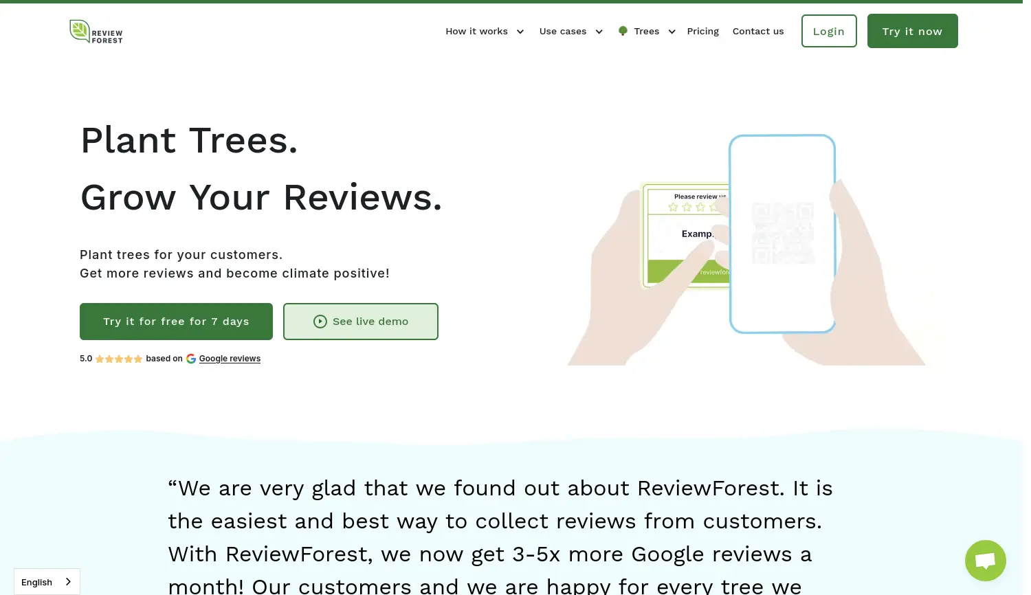 Bäume pflanzen. Bewertungen steigern. ReviewForest ist eine Plattform, die Unternehmen hilft, mehr Kundenrezensionen zu sammeln, indem sie für jede Bewertung Bäume pflanzen.