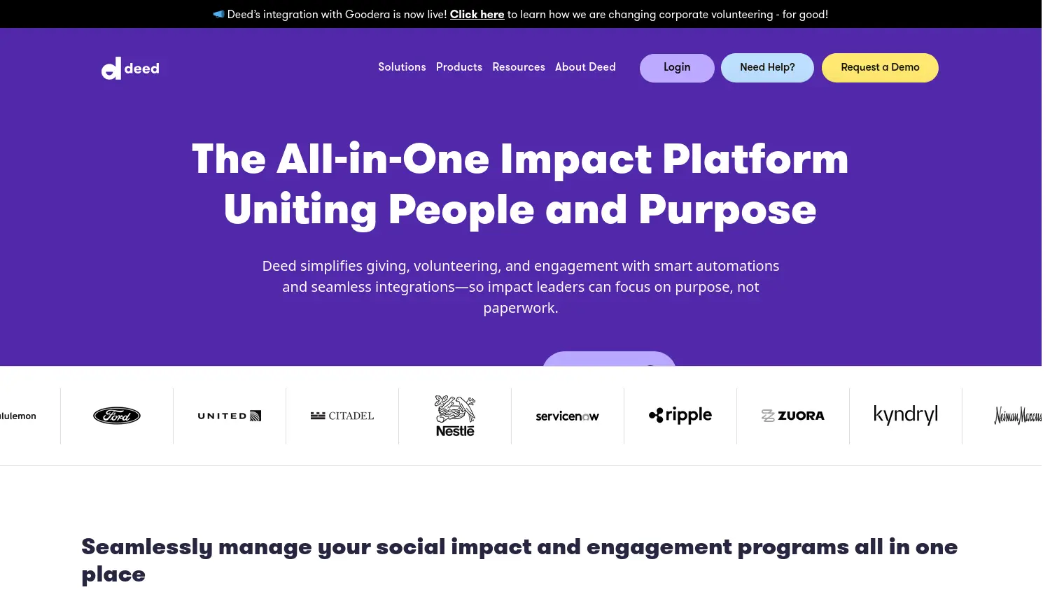 Die All-in-One Impact Plattform, die Menschen und Ziele vereint. Deed ist eine All-in-One-Plattform, die Unternehmen bei Mitarbeiterengagement, Freiwilligenarbeit, Spenden- und Grants-Management unterstützt.