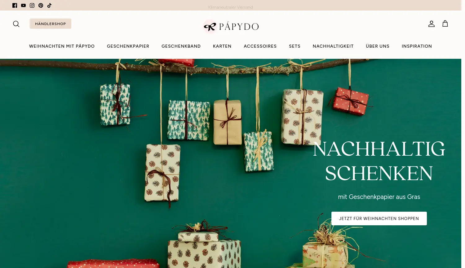 Nachhaltig Schenken mit umweltfreundlichem Geschenkpapier aus Graspapier. PÁPYDO verkauft nachhaltige und plastikfreie Geschenkverpackungen, Grußkarten und Accessoires, die aus innovativem und kompostierbarem Graspapier hergestellt werden.