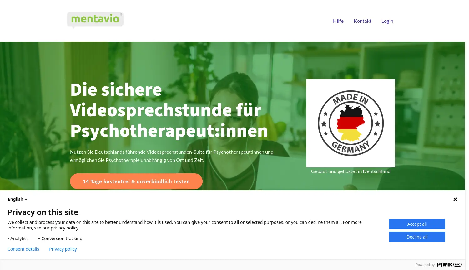 Die sichere Videosprechstunde für Psychotherapeut:innen – unabhängig von Ort und Zeit. mentavio bietet Psychotherapeut:innen eine sichere, zertifizierte Videosprechstunden-Suite mit umfassenden Tools für digitale Therapie und Praxisverwaltung.