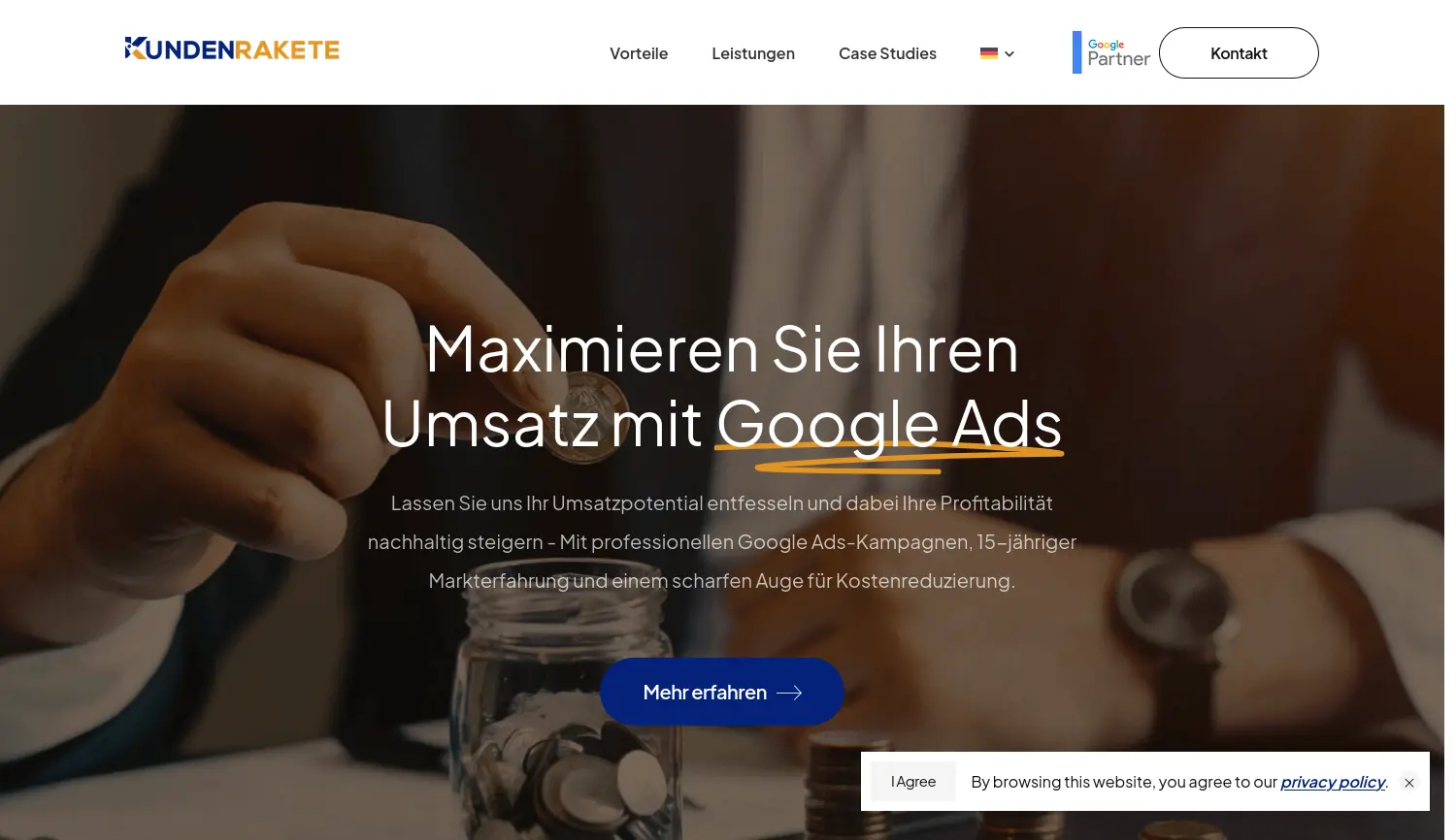 Maximieren Sie Ihren Umsatz mit professioneller Google Ads Expertise. Kundenrakete ist eine spezialisierte Google Ads-Agentur, die Unternehmen dabei unterstützt, Werbeausgaben zu optimieren und Umsatz sowie Profitabilität nachhaltig zu steigern.