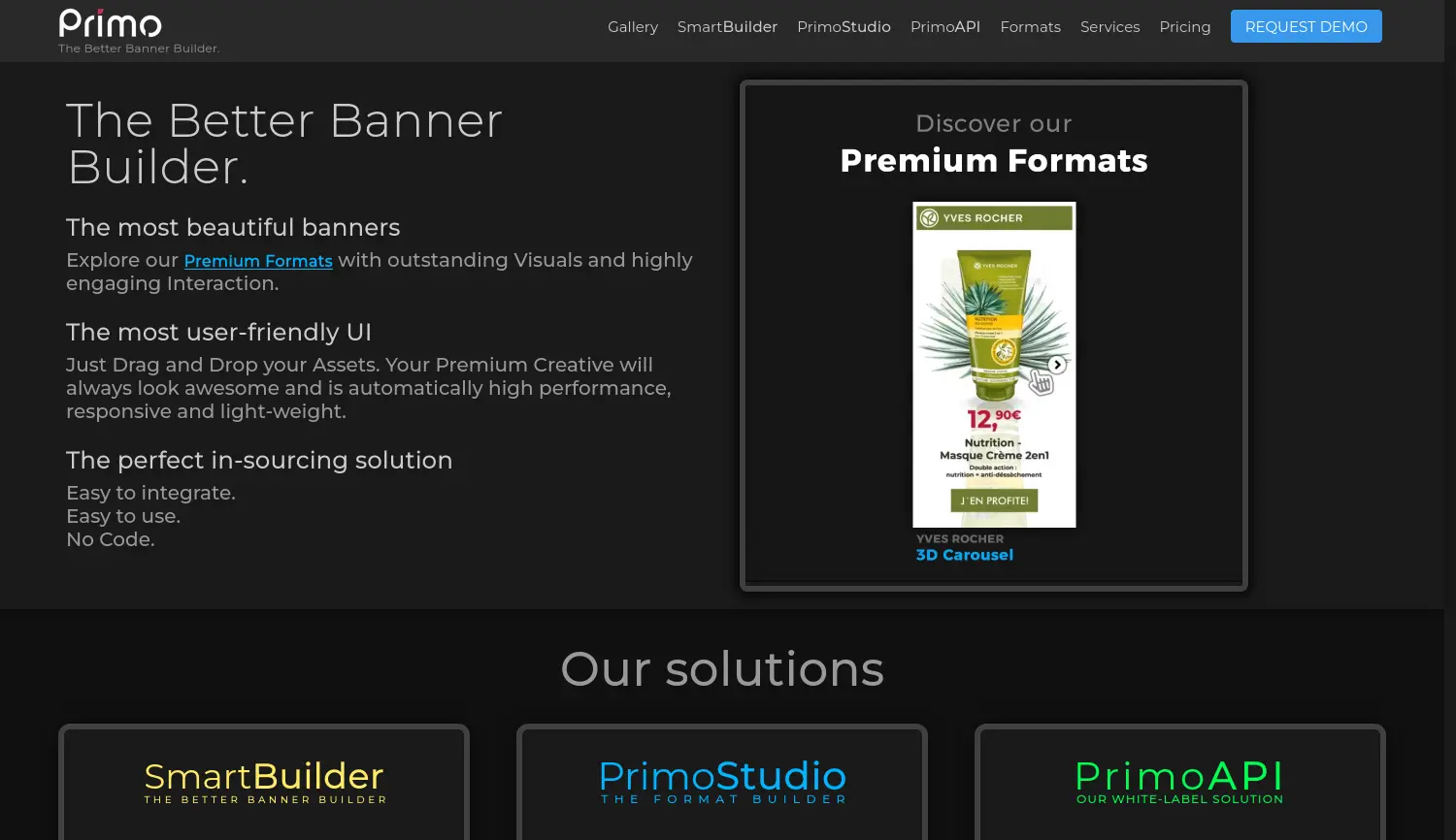 The Better Banner Builder – Die Plattform für Premium-Display-Werbung und Creative Automation. Primo ist eine No-Code-SaaS-Plattform, die Marken die Erstellung, Verwaltung und Automatisierung von hochinteraktiven Premium-Display-Bannern ermöglicht.