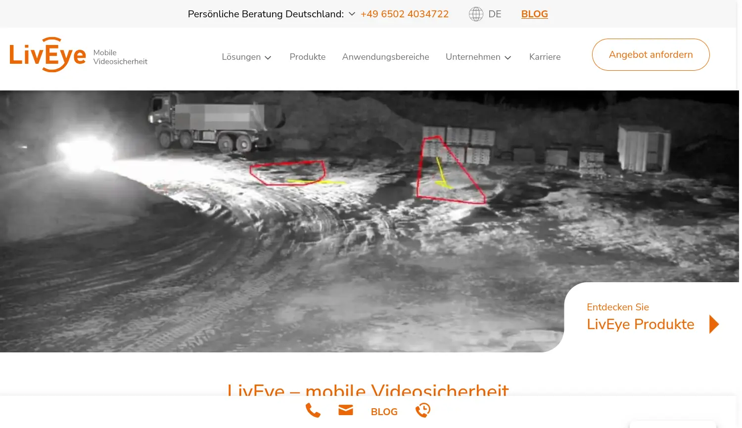 Mobile Videoüberwachung | 24/7 Leitstelle | LivEye Schutz LivEye bietet mobile Videoüberwachungssysteme mit KI-gestützter Analyse und 24/7 Leitstelle zum effektiven Schutz von Projekten und Gelände vor Diebstahl und Vandalismus.