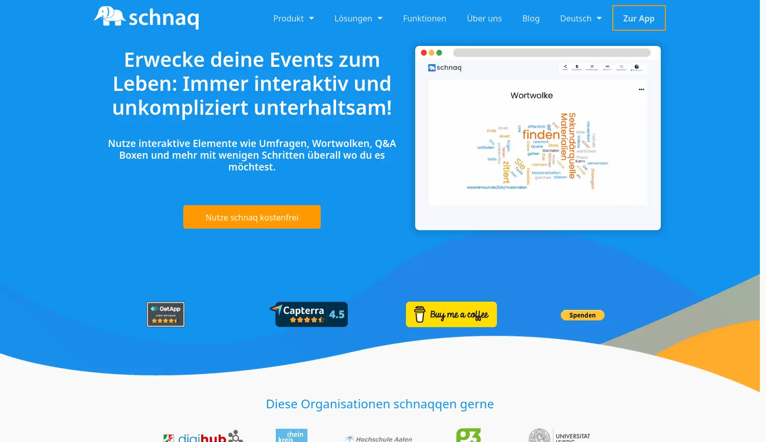 Erwecke deine Events zum Leben: Immer interaktiv und unkompliziert unterhaltsam. schnaq ist eine Open Source Plattform, die interaktive Elemente wie Umfragen, Wortwolken und Q&A-Boxen für Events, Bildung und Meetings bereitstellt, um das Publikum unkompliziert zu aktivieren.