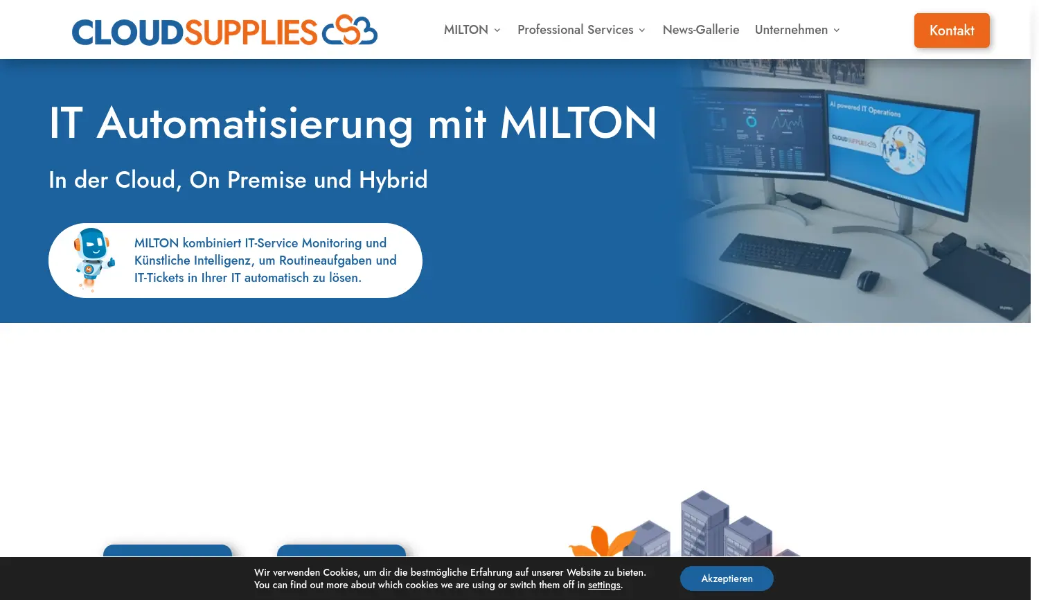 IT-Automatisierung mit Künstlicher Intelligenz: Vom Cost-Center zum Profit-Center. CLOUDSUPPLIES automatisiert mithilfe der KI-Plattform MILTON Routineaufgaben und IT-Tickets, um den IT-Betrieb effizienter zu gestalten und Störungen zu minimieren.