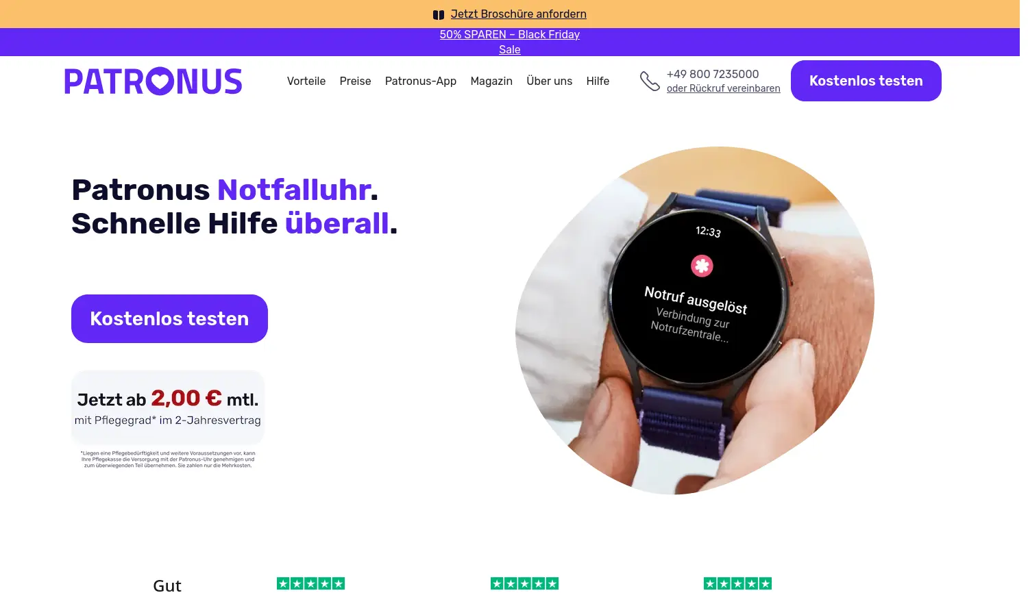 Die Notruf-Uhr, die Leben schützt und Senioren Sicherheit im Alltag schenkt. Patronus bietet eine moderne, unauffällige Notfalluhr für Senioren an, die deutschlandweit schnelle Hilfe über eine 24/7-Notrufzentrale oder die Familie gewährleistet.