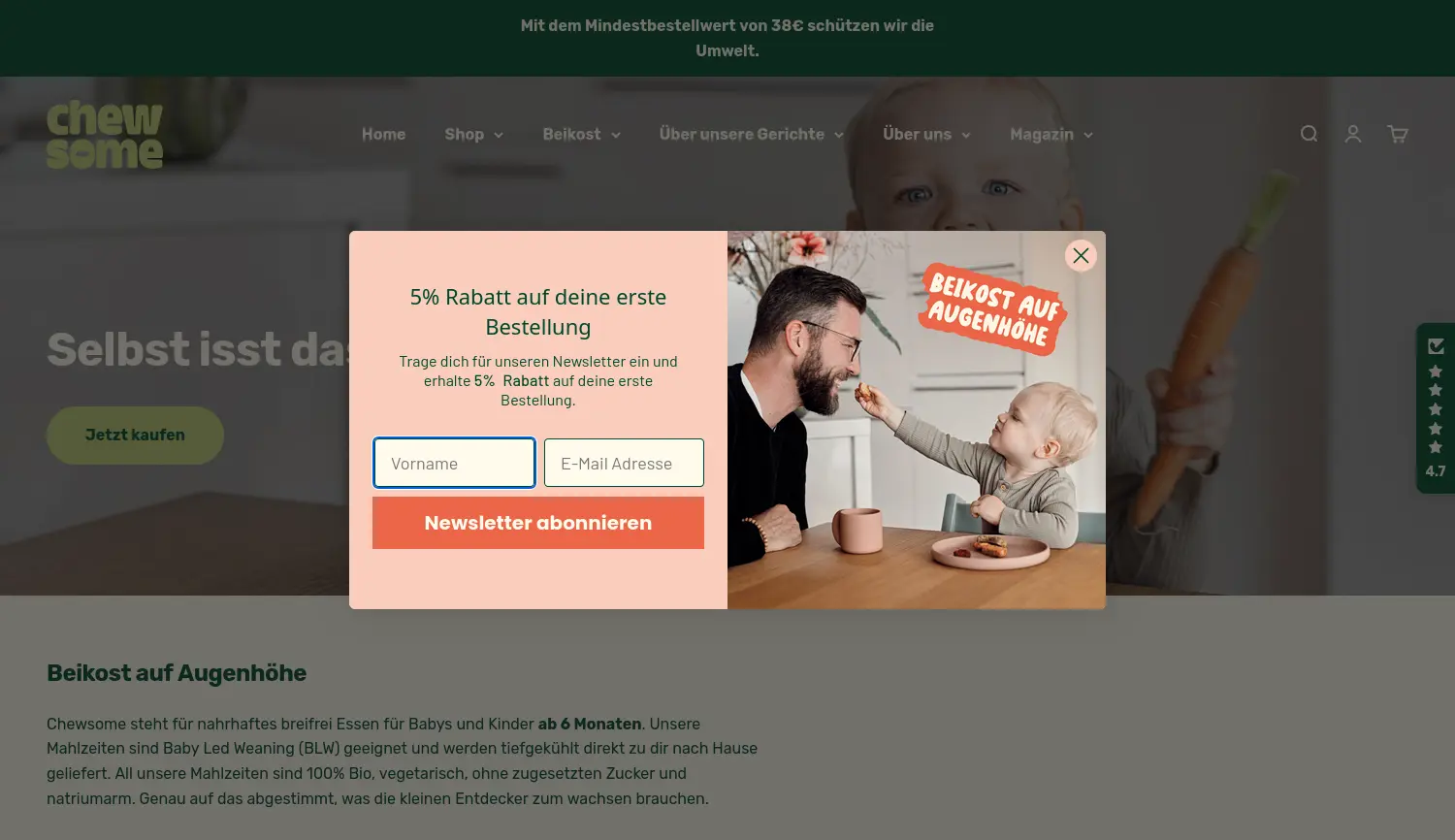 Selbst isst das Baby! Nahrhaftes breifrei Essen für Babys und Kinder ab 6 Monaten. Chewsome bietet tiefgekühlte, breifreie Bio-Gemüse-Bites und Bällchen an, die sich ideal für Babys ab 6 Monaten und Baby Led Weaning (BLW) eignen.