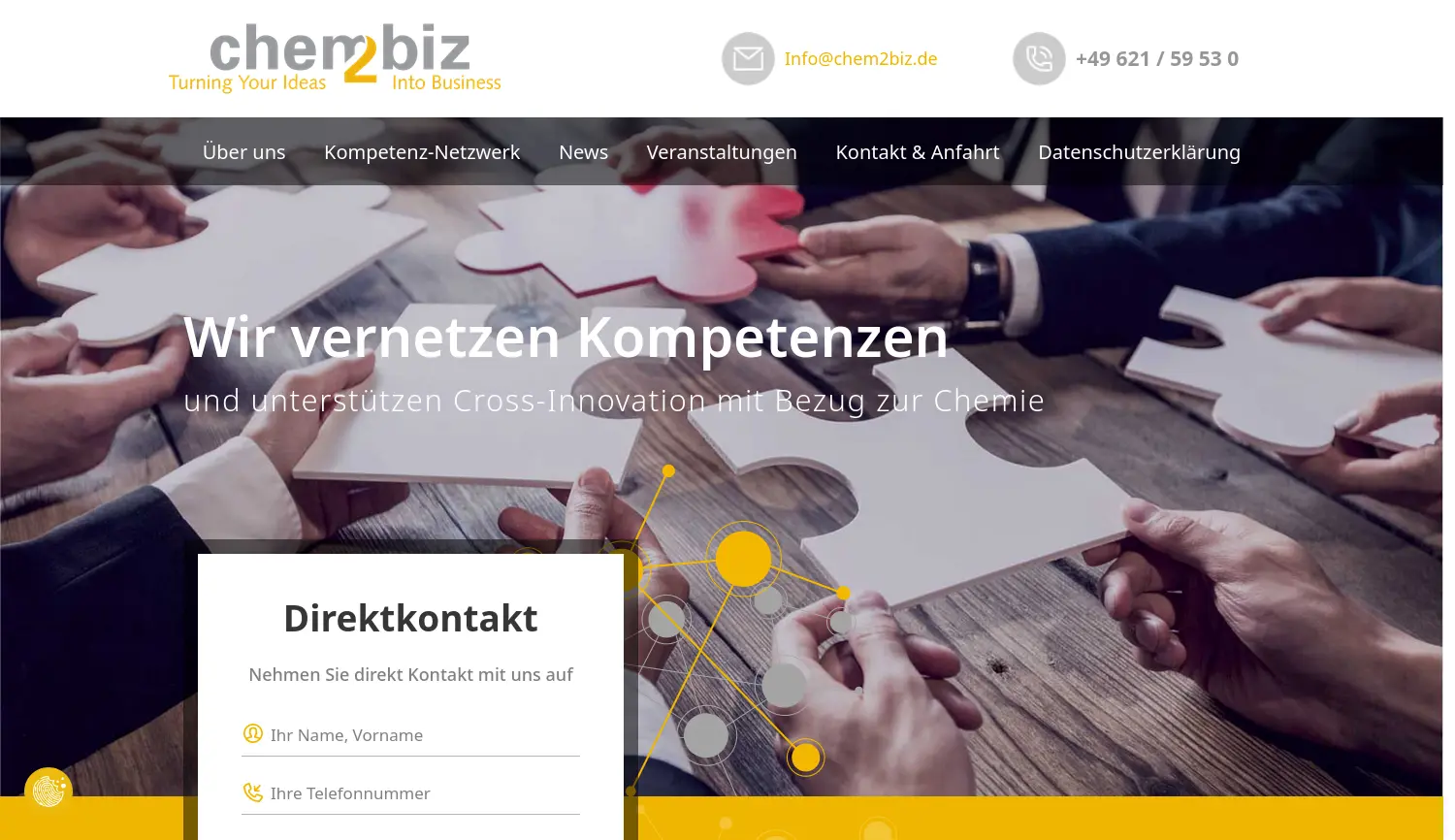 Entdecke die Chemie der Innovation: Chem2biz - Gemeinsam für neue Wege in der Wirtschaft Chem2biz ist ein Kompetenznetzwerk, das Unternehmensgründer, Start-ups und bestehende Unternehmen aus chemienahen Bereichen unterstützt, um Cross-Innovation-Potenziale mit Chemiebezug aufzuzeigen und neue Wertschöpfungsketten zu schaffen.