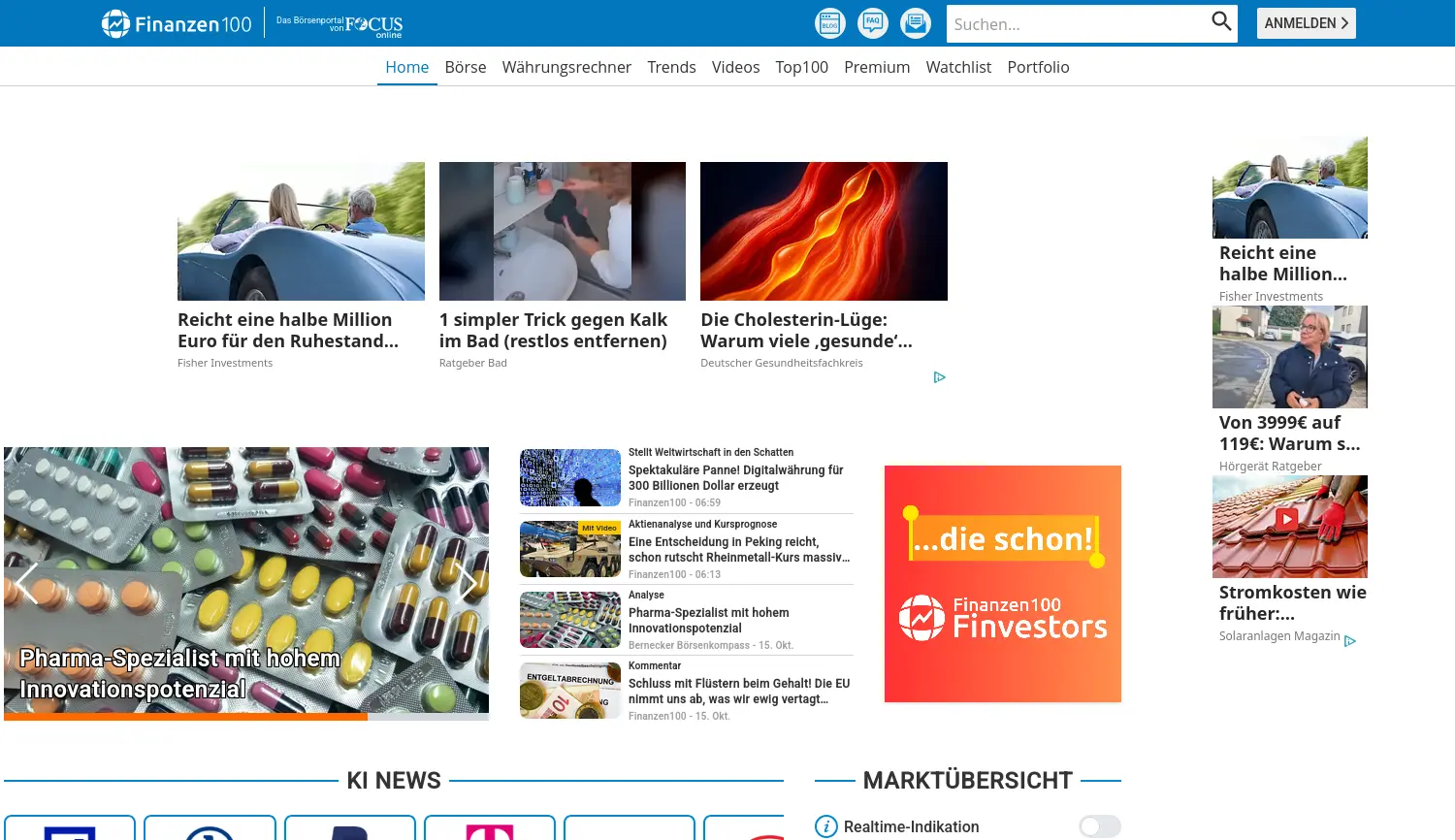 Das Börsenportal für Finanznachrichten, Aktienanalysen und Markttrends. Finanzen100 ist ein umfassendes Online-Börsenportal, das aktuelle Finanznachrichten, Analysen und Kurse für private Anleger bereitstellt.