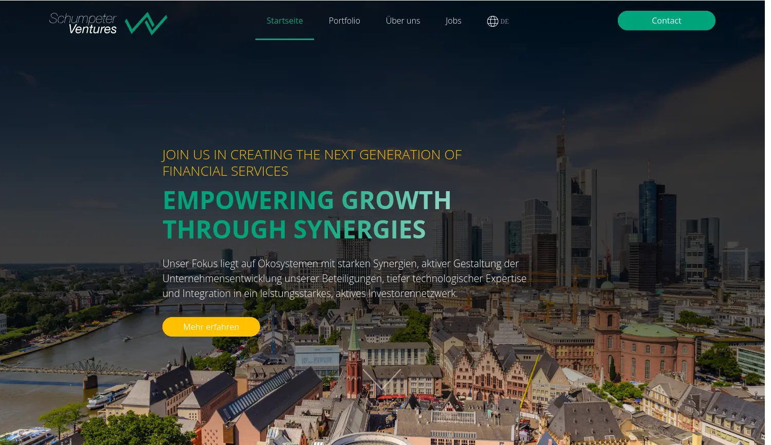Die nächste Generation digitaler Finanzdienstleistungen mit Synergien und Wachstum aktiv gestalten. Schumpeter Ventures ist ein Venture Capital Fonds, der in innovative FinTech- und InsurTech-Startups investiert, um Synergien zu schaffen und deren Wachstum aktiv zu fördern.