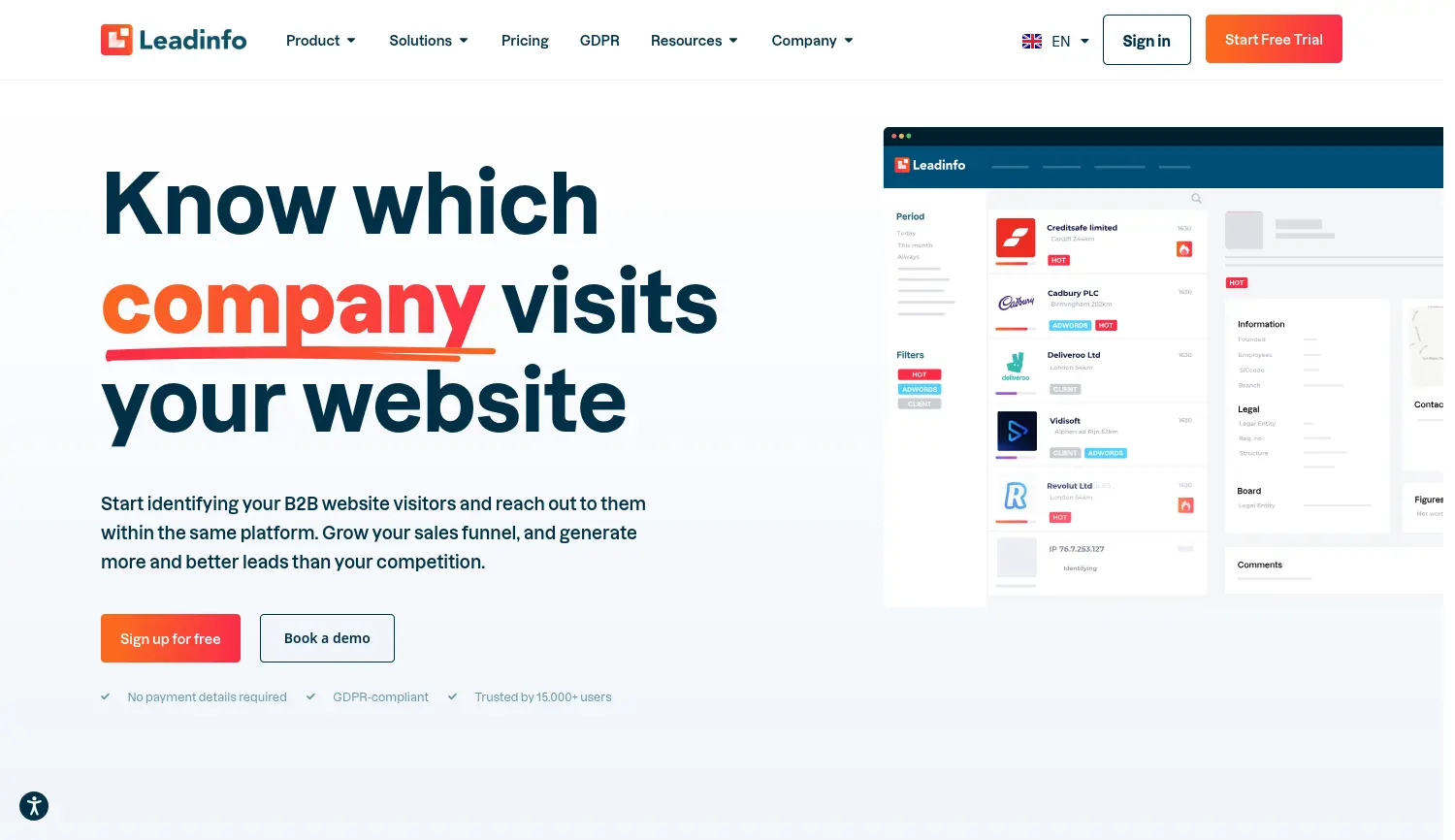 Erfahren Sie, welche Unternehmen Ihre Website besuchen. Leadinfo identifiziert anonyme B2B-Website-Besucher in Echtzeit und liefert Kontaktdaten zur Steigerung des Vertriebserfolgs.