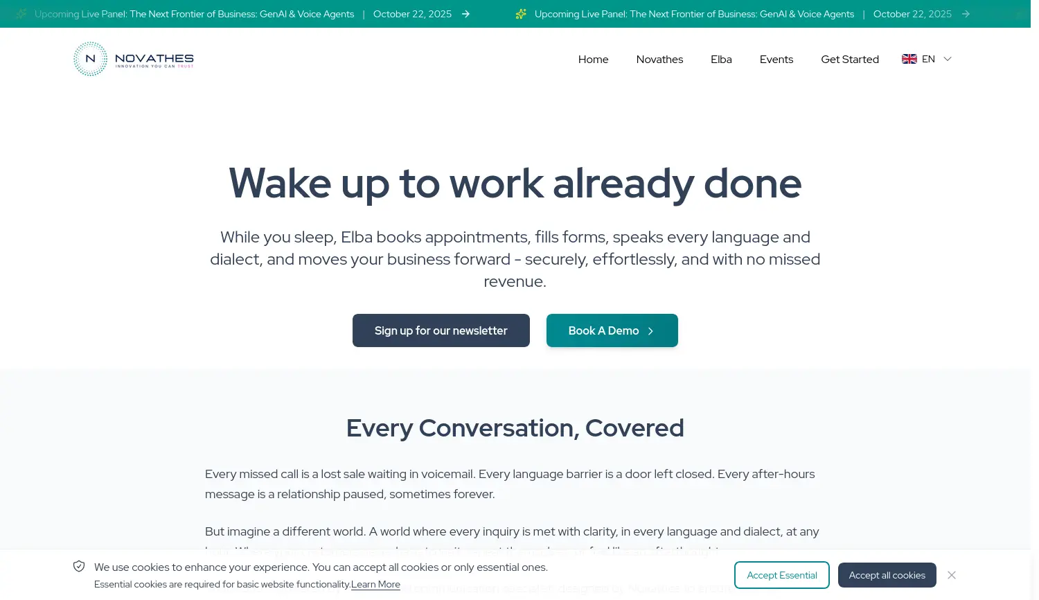 KI-Agenten, die einfach für Sie arbeiten. Sicher. Vertrauenswürdig. Grenzenlos. Novathes entwickelt Elba, einen multilingualen und DSGVO-konformen KI-Agenten, der für Unternehmen komplexe Kommunikations- und Verwaltungsprozesse übernimmt.