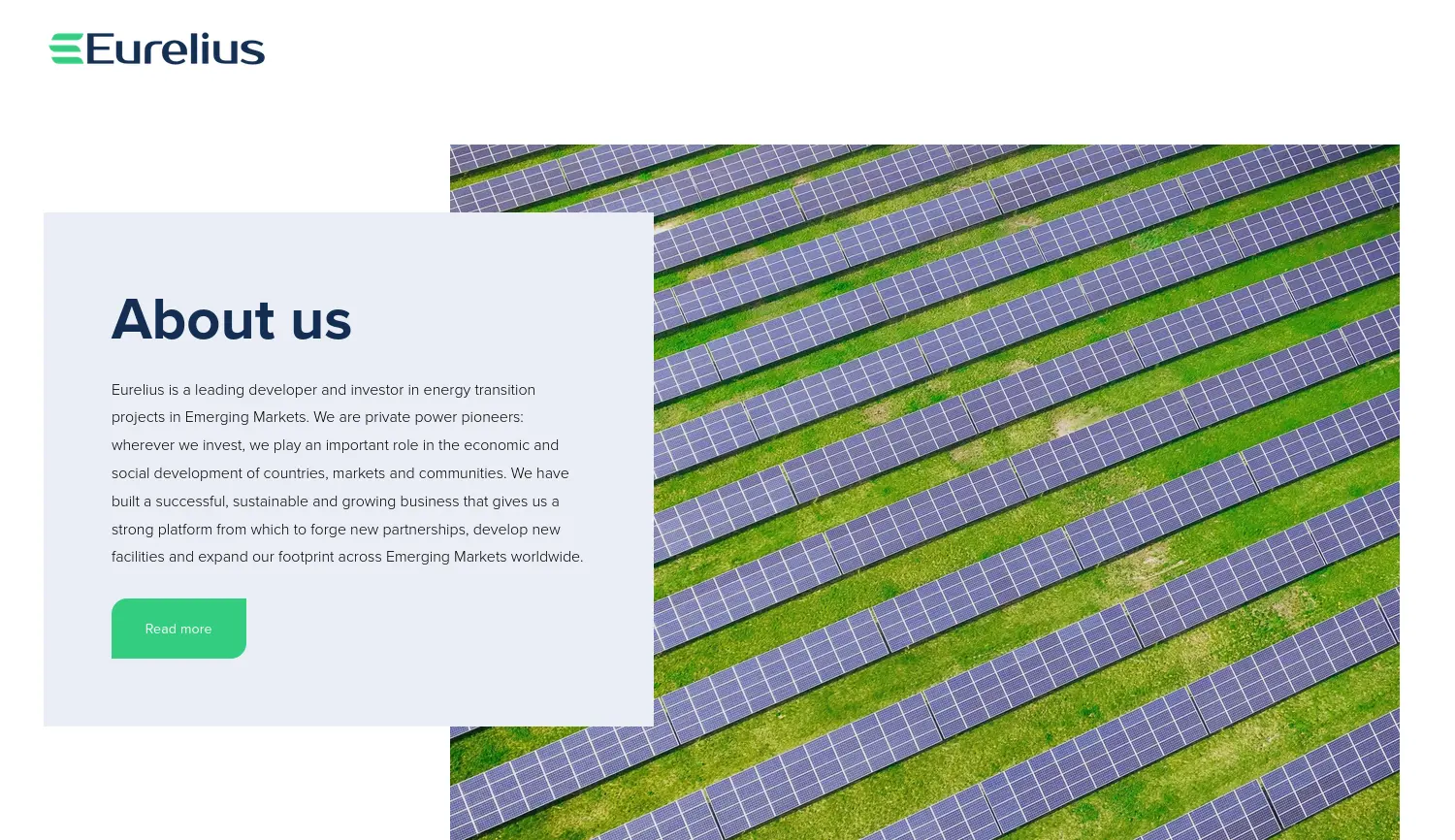Entwicklung und Investition in die Energiewende in Schwellenländern. Eurelius entwickelt und investiert in Projekte zur Energiewende, hauptsächlich in Schwellenmärkten, um die wirtschaftliche Entwicklung voranzutreiben.