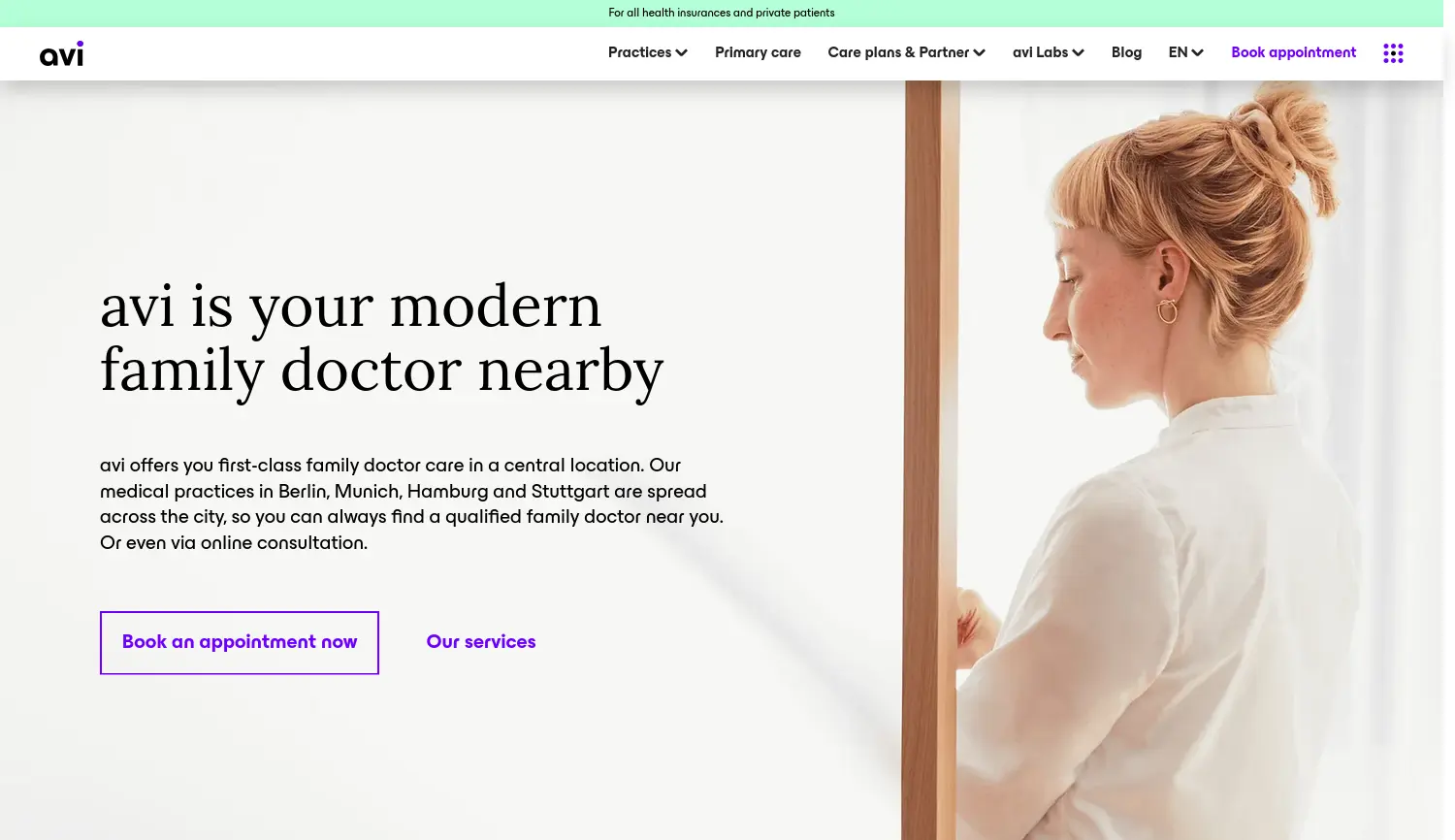 Die moderne Hausarztpraxis für erstklassige und digitale medizinische Betreuung. avi medical bietet moderne hausärztliche Versorgung in zentralen Praxen in deutschen Großstädten, kombiniert mit digitaler Terminbuchung per App und Online-Sprechstunden.
