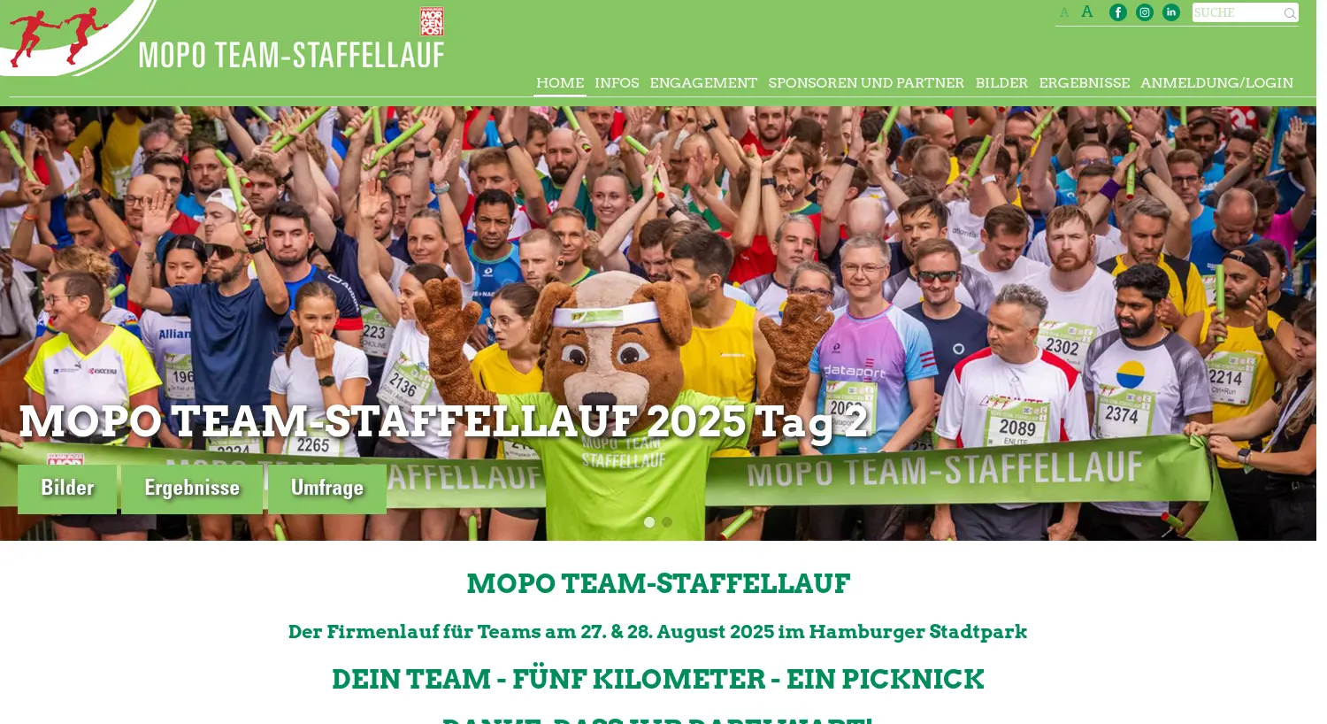 DEIN TEAM - FÜNF KILOMETER - EIN PICKNICK Der MOPO Team-Staffellauf ist Hamburgs größter Firmen-Staffellauf, der Unternehmen zu sportlicher Betätigung und einem anschließenden Picknick im Stadtpark zusammenbringt.