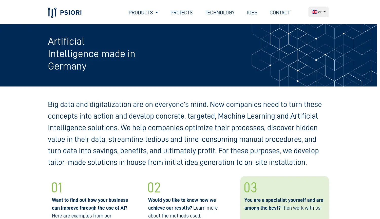 Künstliche Intelligenz made in Germany PSIORI entwickelt maßgeschneiderte Lösungen für Künstliche Intelligenz und Maschinelles Lernen, um Unternehmensprozesse zu optimieren und verborgene Datenwerte zu erschließen.
