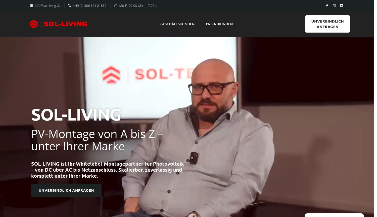 Ihr Whitelabel-Partner für skalierbare PV-Montage Sol-Living ist ein Whitelabel-Montagepartner für Photovoltaikanlagen, der Unternehmen bei der Skalierung ihrer Solarprojekte unterstützt.