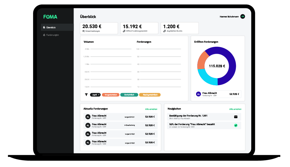 Die beste Art, Ihre Forderungen einfach, flexibel und digital zu managen. FOMA bietet digitales End-to-End Anwaltsinkasso und Insolvenzmanagement, um offene Forderungen schnell, effizient und kundenorientiert zu realisieren.
