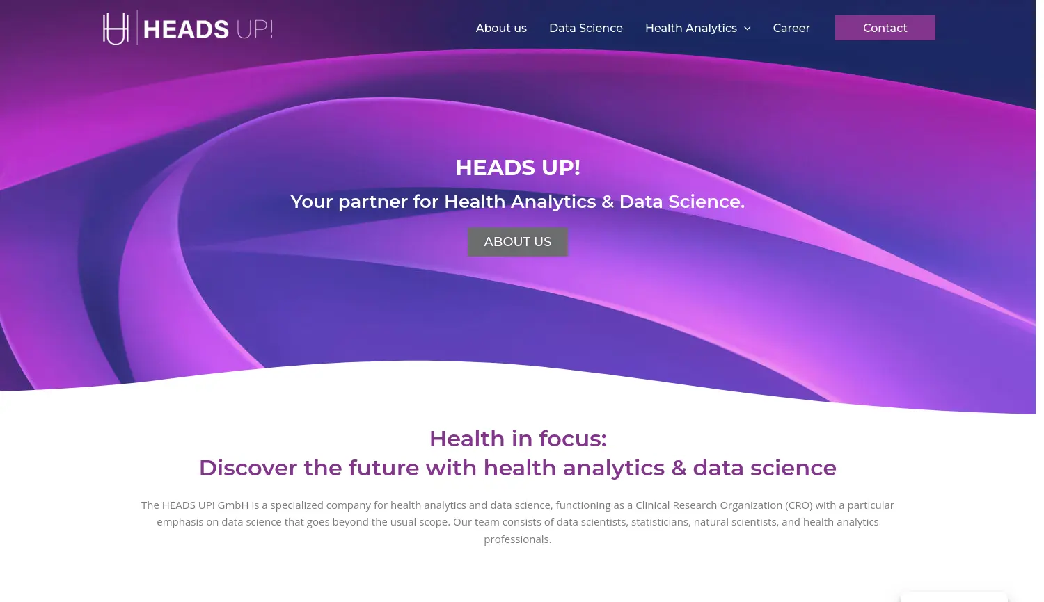 Ihr Partner für Gesundheitsanalytik und Data Science. HEADS UP! GmbH ist ein spezialisiertes Unternehmen für Gesundheitsanalytik und Data Science, das als Clinical Research Organization (CRO) innovative Lösungen anbietet.