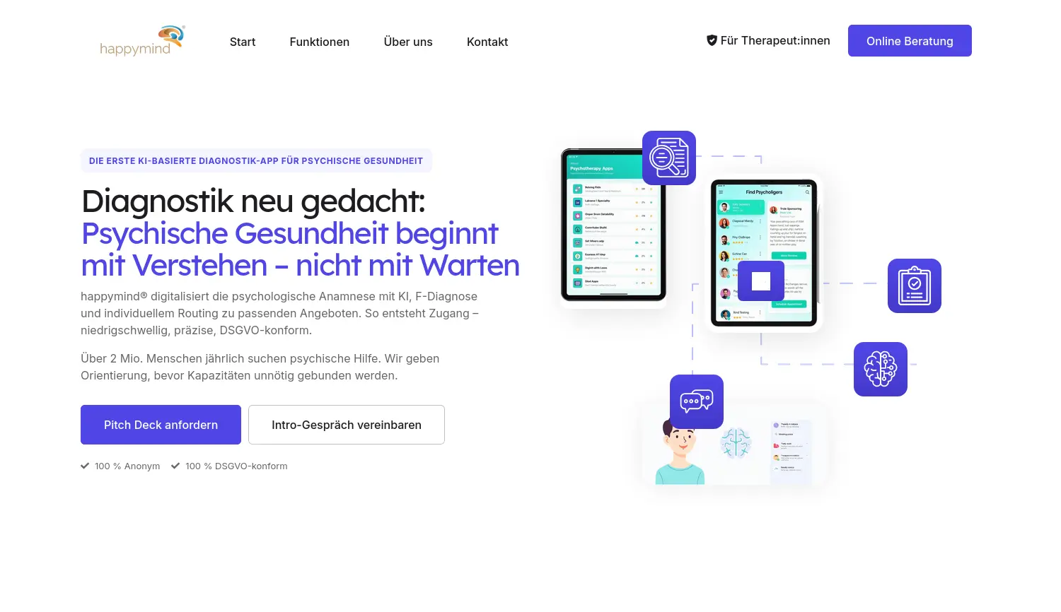 Diagnostik neu gedacht: Psychische Gesundheit beginnt mit Verstehen – nicht mit Warten. happymind ist eine KI-basierte Diagnostik-App zur psychologischen Selbstanamnese, die Belastungen erkennt und zu passenden Hilfsangeboten routet.