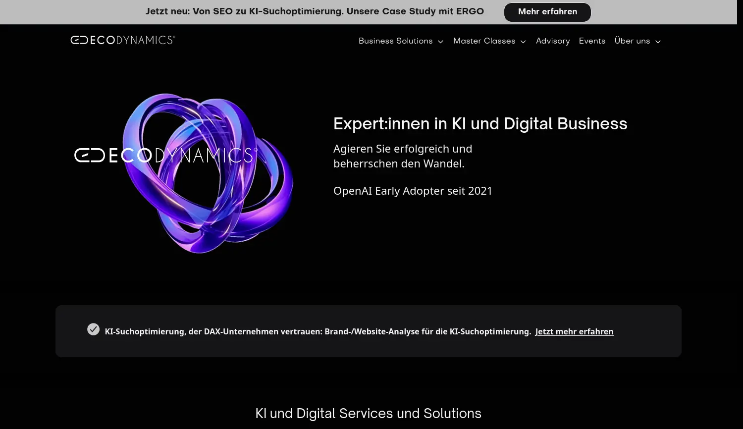 Experten für Generative KI & Digitale Geschäftslösungen und KI-Suchoptimierung. ECODYNAMICS ist eine auf Generative KI spezialisierte Unternehmensberatung, die Unternehmen bei KI-Strategie, Agentenentwicklung und Suchmaschinenoptimierung unterstützt.