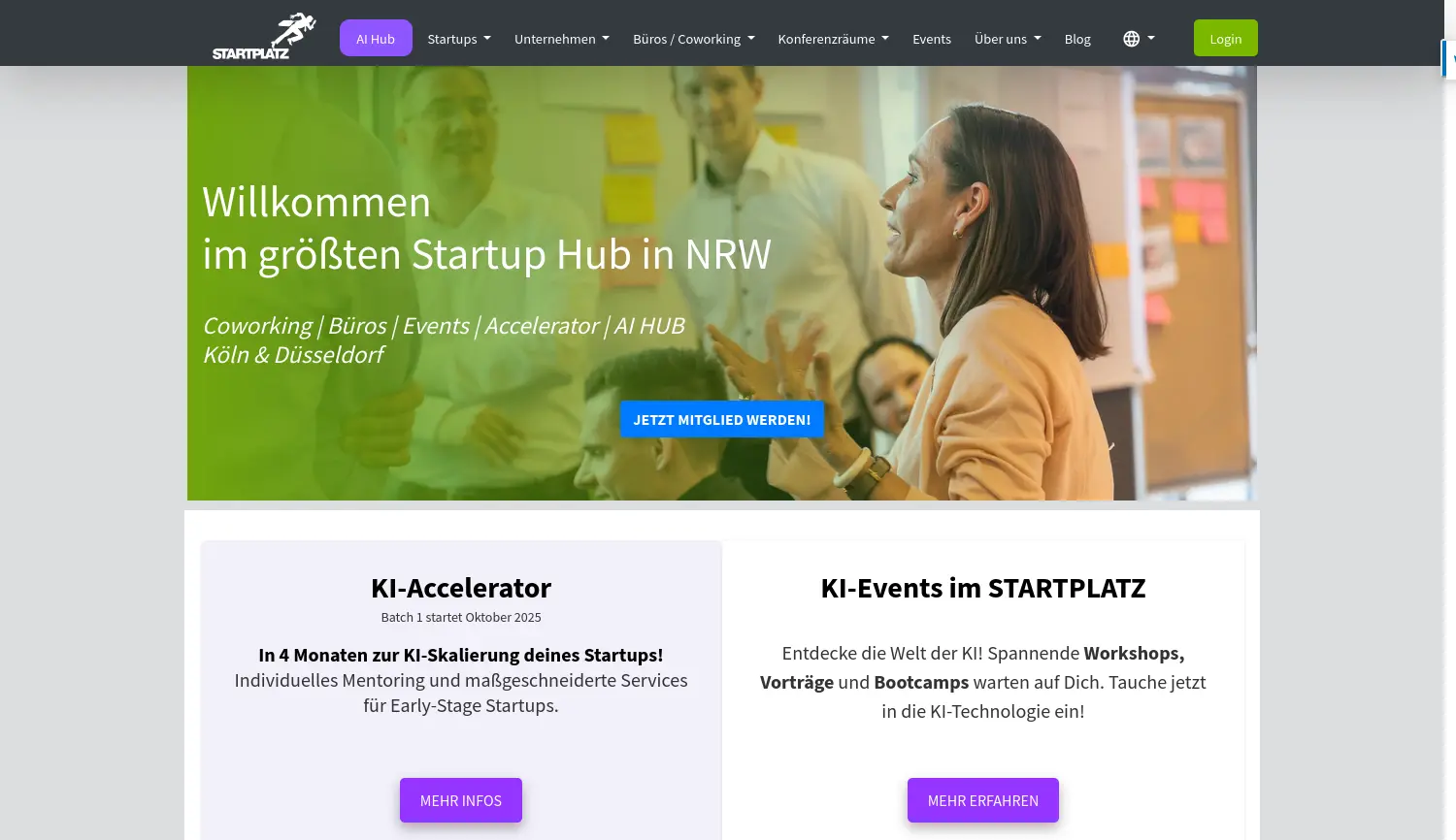 Der Inkubator für deine Startup-Vision Der STARTPLATZ ist der größte Startup Hub, Inkubator und Accelerator in NRW und bietet Coworking Spaces, Events, Mentoring und Programme zur Förderung von Startups in Köln und Düsseldorf.