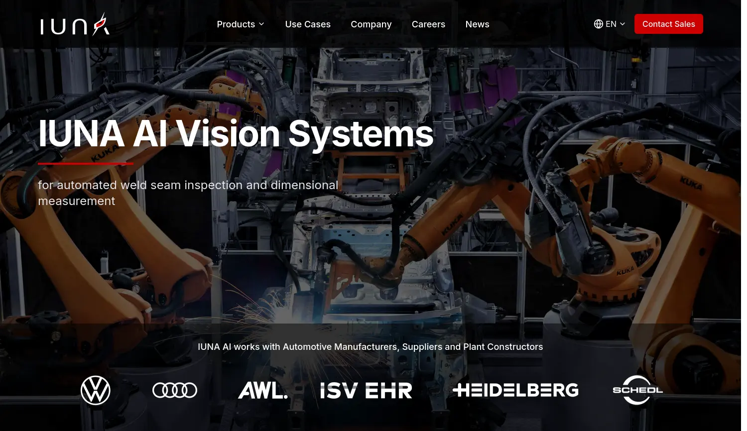 KI-Vision-Systeme für die automatisierte Qualitätskontrolle in der industriellen Fertigung. IUNA AI entwickelt KI-gestützte Vision-Systeme zur vollautomatischen Schweißnahtprüfung und Dimensionsmessung in der Automobil- und Fertigungsindustrie.