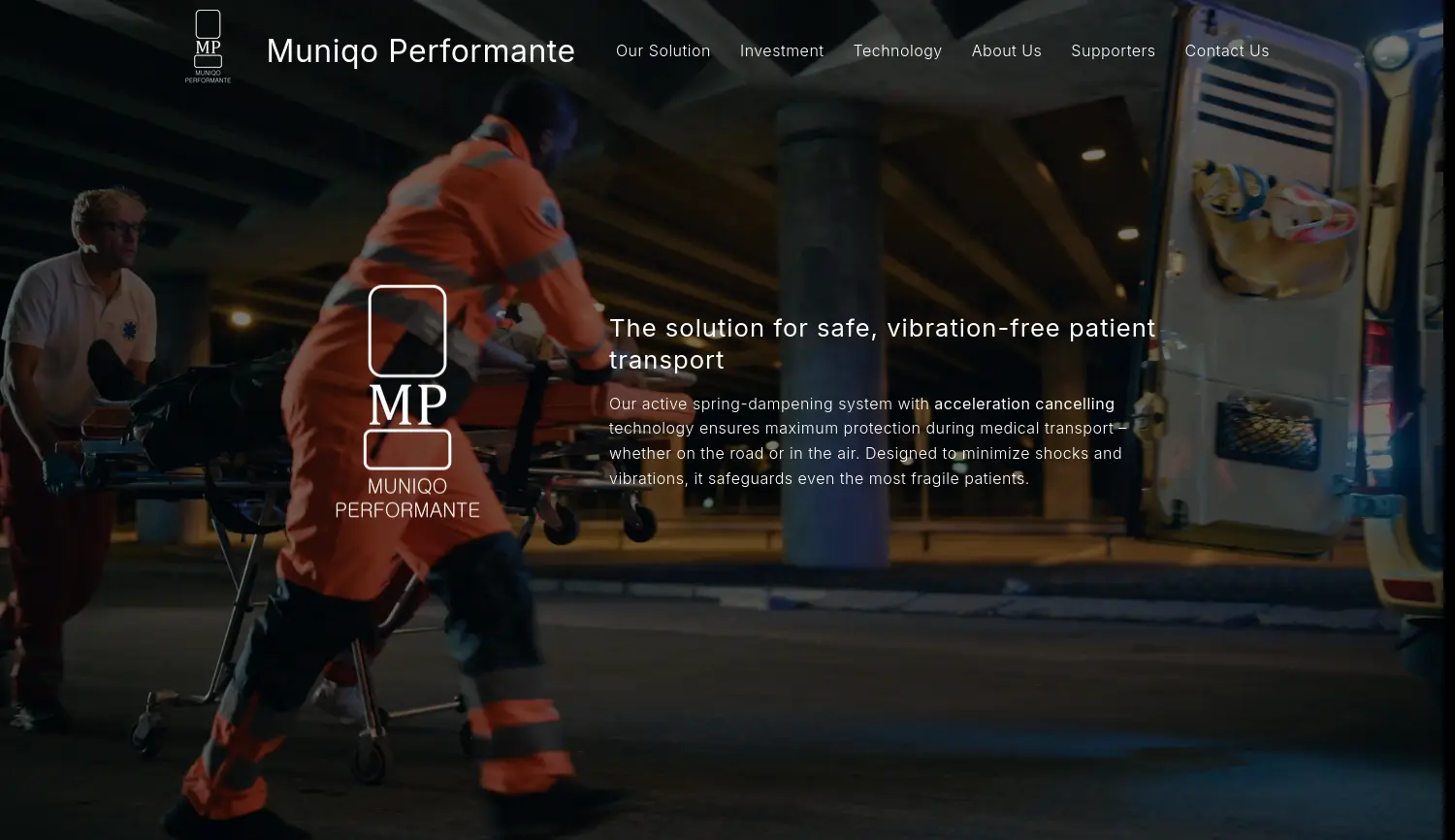 Die Lösung für den sicheren, vibrationsfreien Patiententransport durch Innovation. Muniqo Performante entwickelt ein aktives Federungs- und Dämpfungssystem, das mittels KI Schocks und Vibrationen beim kritischen Patiententransport fast vollständig neutralisiert.