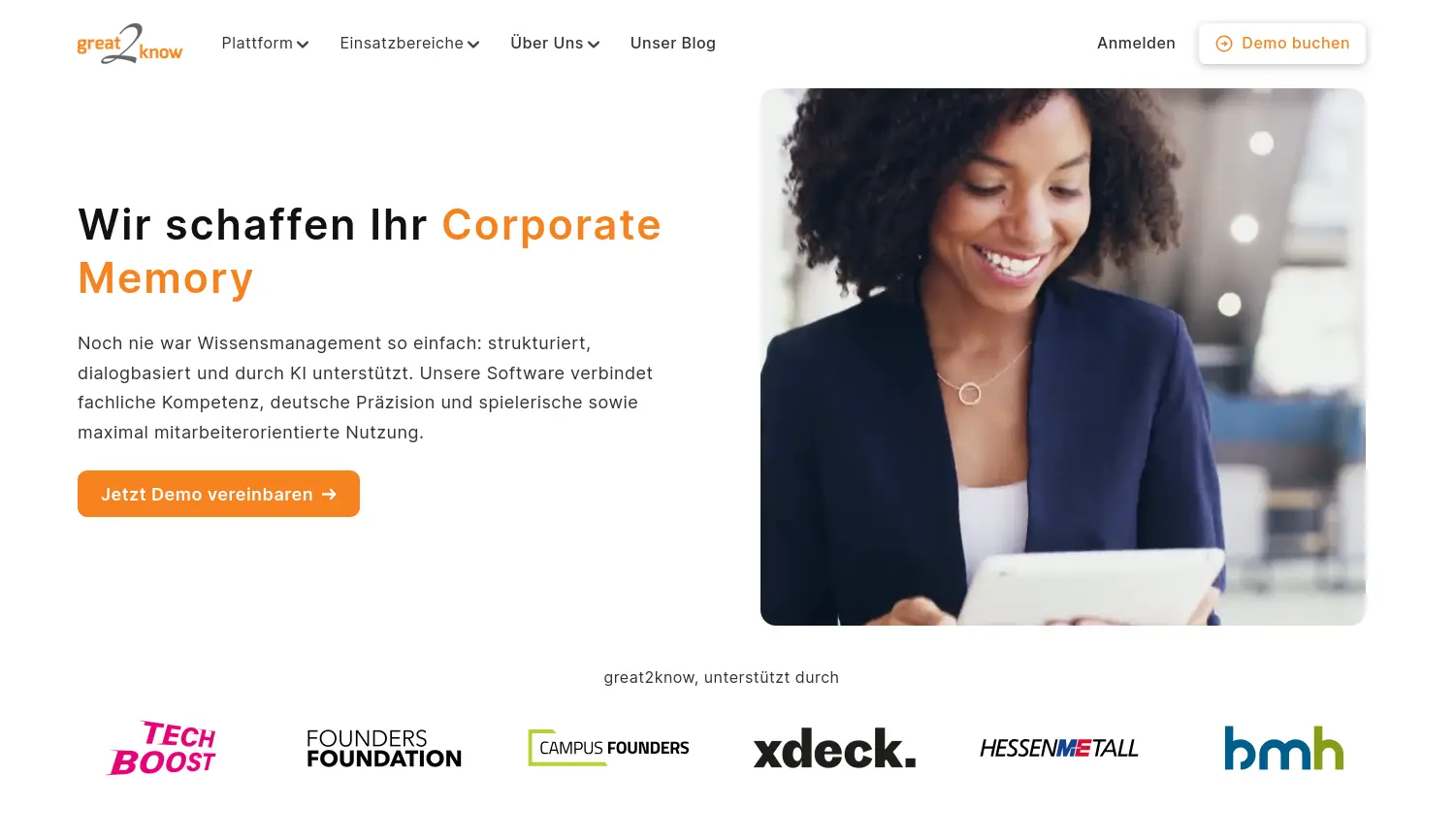 Wir schaffen Ihr Corporate Memory great2know bietet eine KI-gestützte SaaS-Plattform zur Strukturierung, Dokumentation und Sicherung wertvollen, verborgenen Fachwissens in Unternehmen.
