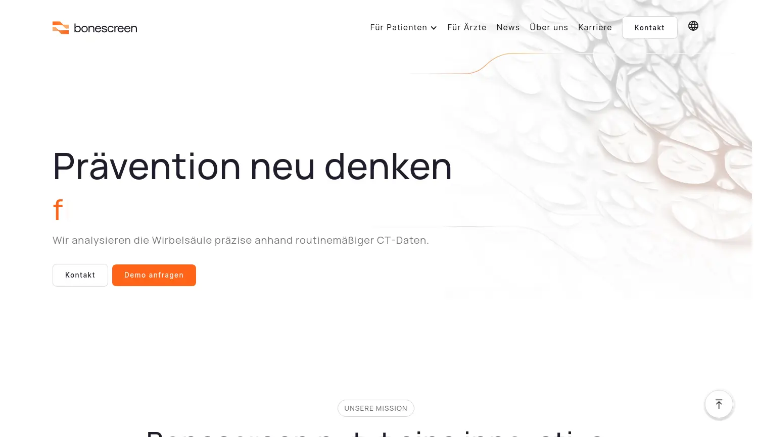 KI-gestützte Präzision für die Bewertung der Wirbelsäulengesundheit und Osteoporose-Diagnose. Bonescreen nutzt innovative KI-Technologie, um die Wirbelsäule präzise anhand routinemäßiger CT-Daten zu analysieren und Ärzte bei der Diagnose von Knochenerkrankungen wie Osteoporose zu unterstützen.