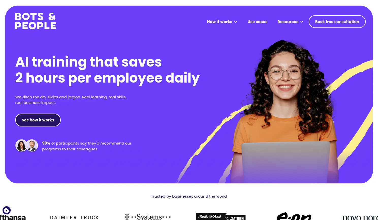 Qualifizieren Sie Ihre Teams für den richtigen Umgang mit Technologie. Bots & People bietet maßgeschneiderte, interaktive B2B-Trainingsprogramme an, die Teams in den Bereichen KI, Automatisierung und Daten qualifizieren, um die Produktivität messbar zu steigern.