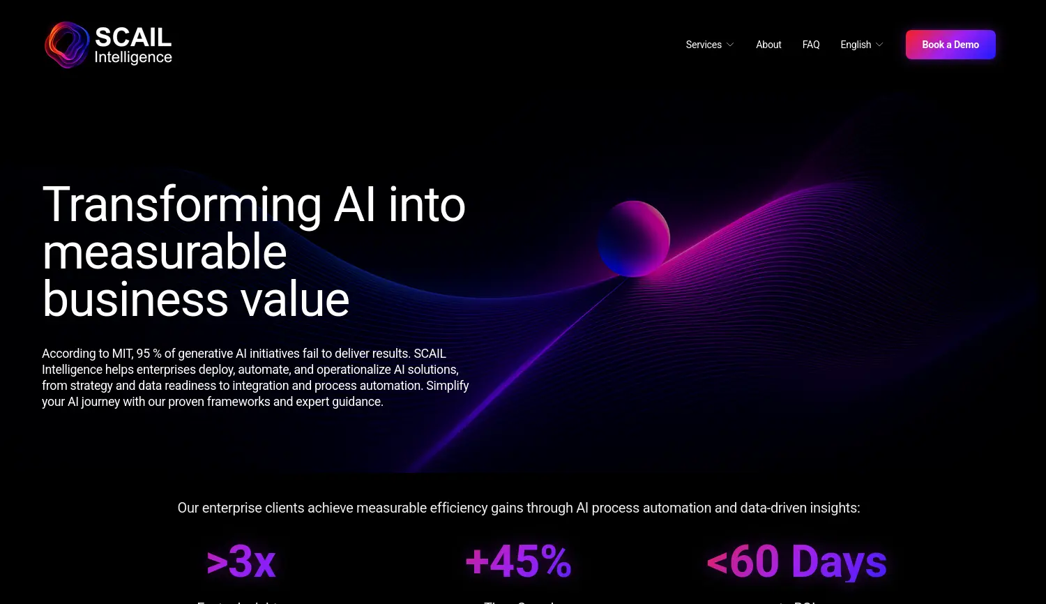 KI in messbaren Geschäftswert umwandeln. SCAIL Intelligence ist eine KI-Beratung aus Frankfurt, die Unternehmen bei der Implementierung von AI-Lösungen zur messbaren Prozessautomatisierung unterstützt.