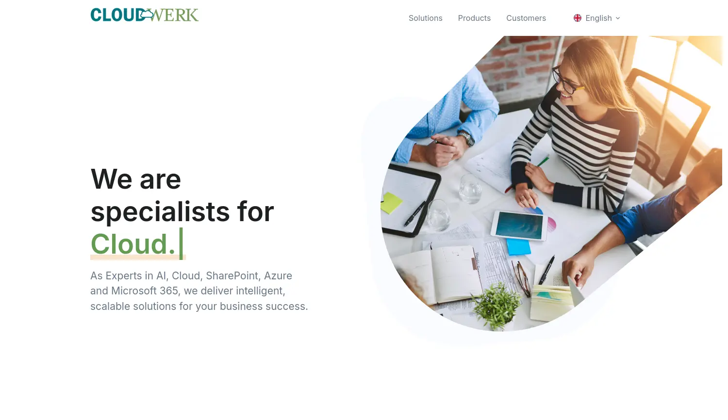 Experten für intelligente, skalierbare Cloud-Lösungen mit Fokus auf Microsoft 365, Azure und KI. CloudWerk ist ein deutsches IT-Unternehmen, das intelligente und skalierbare Lösungen sowie Produkte auf Basis von Microsoft 365, Azure, SharePoint und Künstlicher Intelligenz für den Unternehmenserfolg liefert.