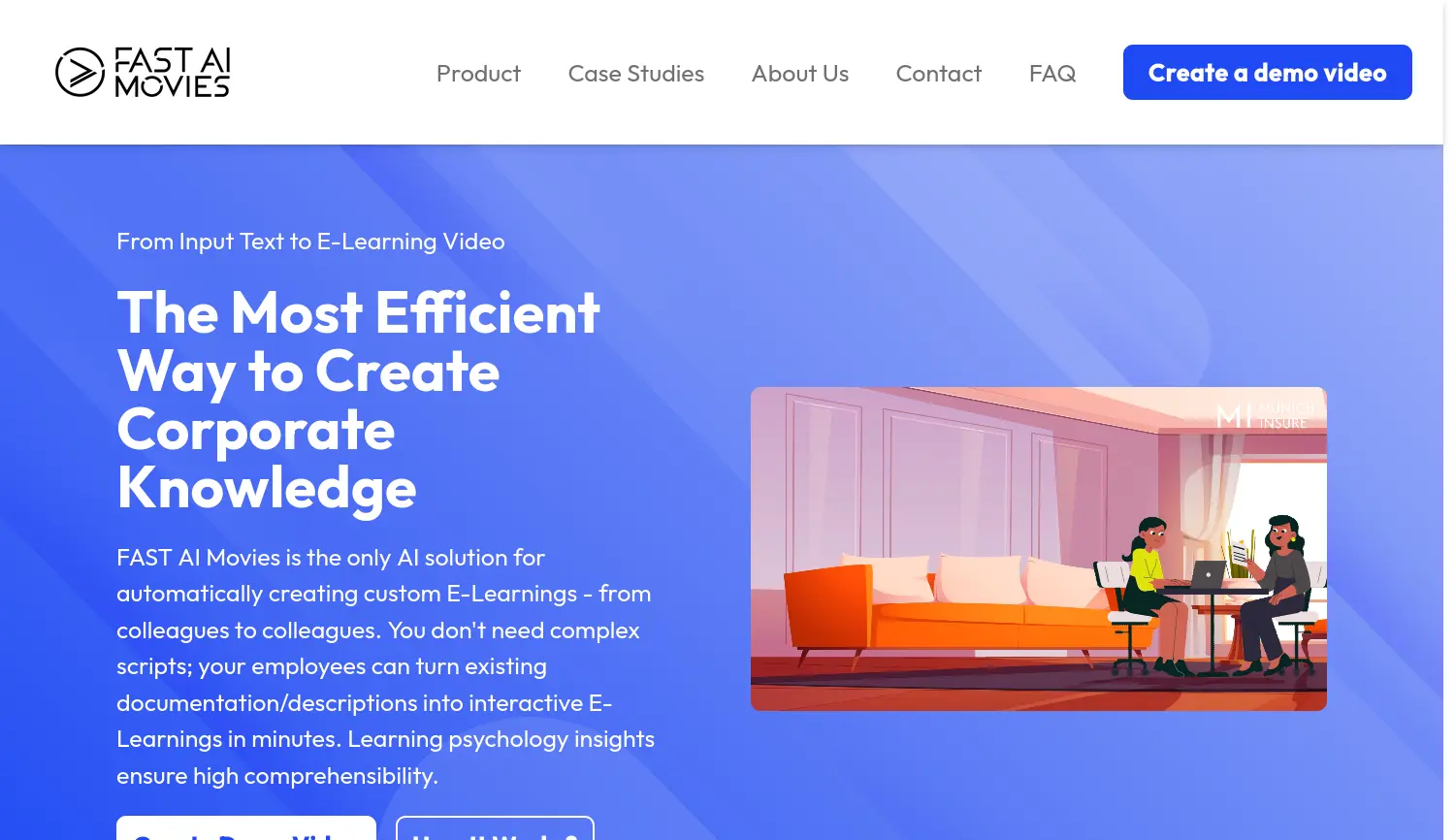 Der effizienteste Weg zur Erstellung von Unternehmenswissen. FAST AI Movies bietet eine KI-Lösung zur automatischen Erstellung von interaktiven und unternehmensspezifischen E-Learning-Videos aus bestehenden Textdokumenten.