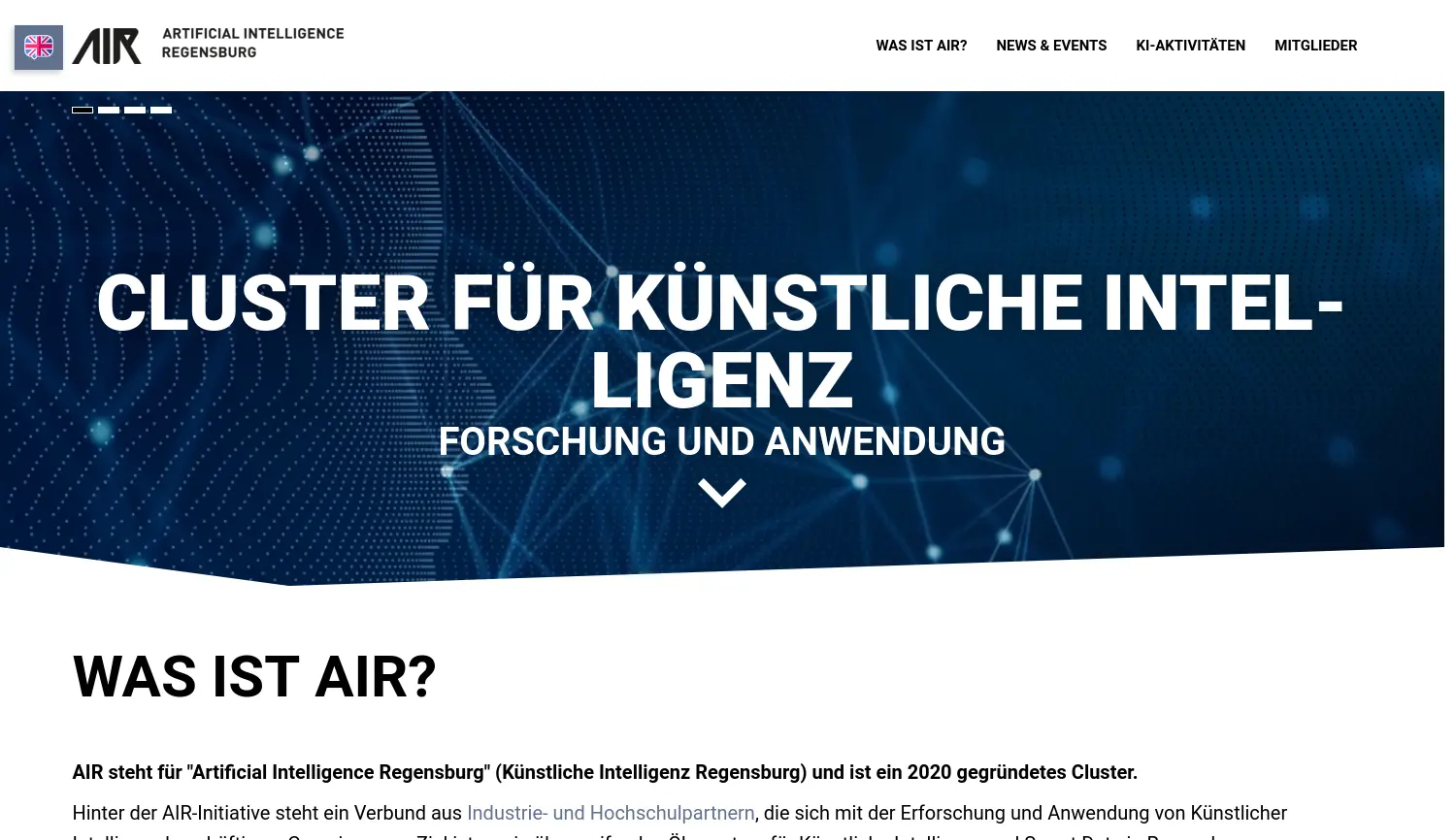Cluster für Künstliche Intelligenz Forschung und Anwendung in Regensburg AIR Artificial Intelligence Regensburg ist ein Cluster, das seit 2020 ein branchenübergreifendes Ökosystem für KI und Smart Data in der Region Regensburg aufbaut.