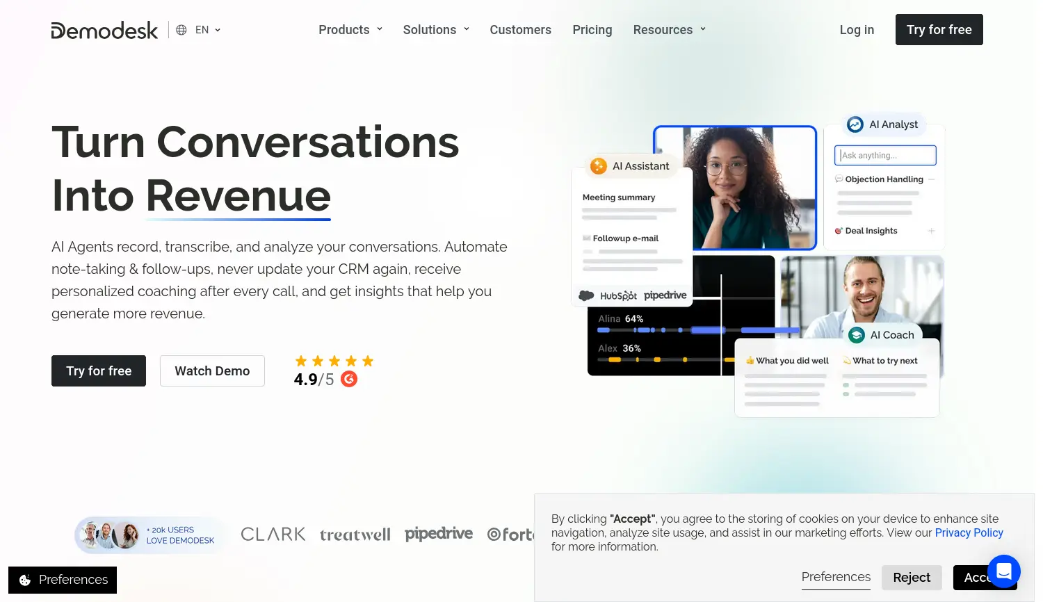 Die vertikale KI-Vertriebsplattform zur Automatisierung und Optimierung von Sales Calls. Demodesk ist eine KI-Vertriebsplattform, die administrative Aufgaben automatisiert und Sales Teams in Echtzeit coacht, um den Umsatz zu steigern.