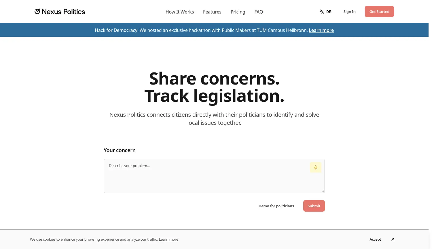 Anliegen teilen. Gesetzgebung verfolgen. Demokratie stärken. Nexus Politics ist eine digitale Plattform zur Stärkung der Demokratie, die Bürger und Politiker effizient verbindet, um Anliegen zu teilen und Gesetzgebung zu verfolgen.