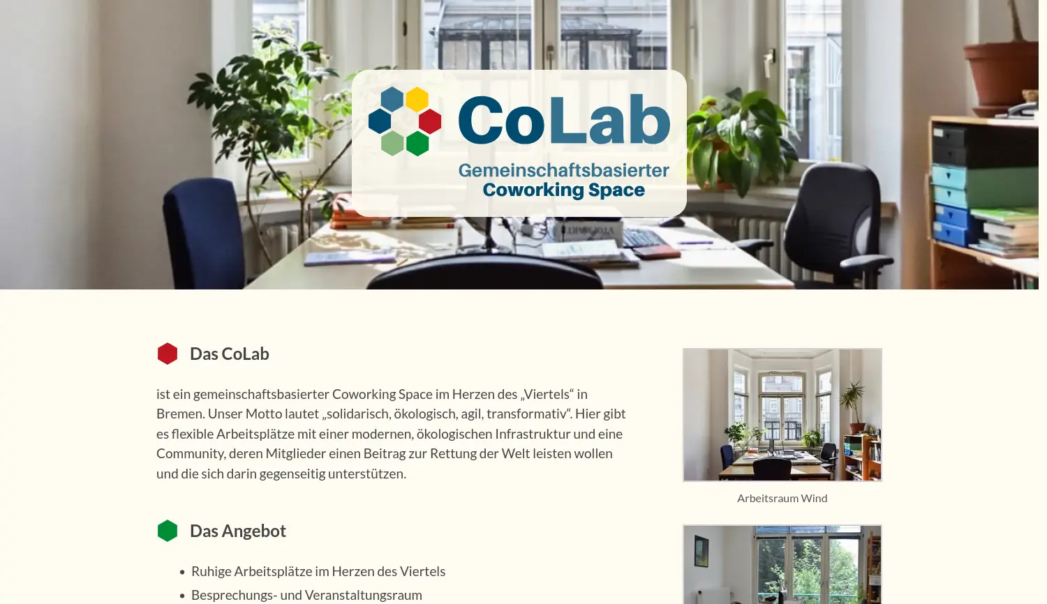 Gemeinschaftsbasierter Coworking Space für solidarische und ökologische Transformation. Das CoLab Bremen ist ein gemeinschaftsbasierter Coworking Space mit solidarischem Preismodell und ökologischem Fokus.