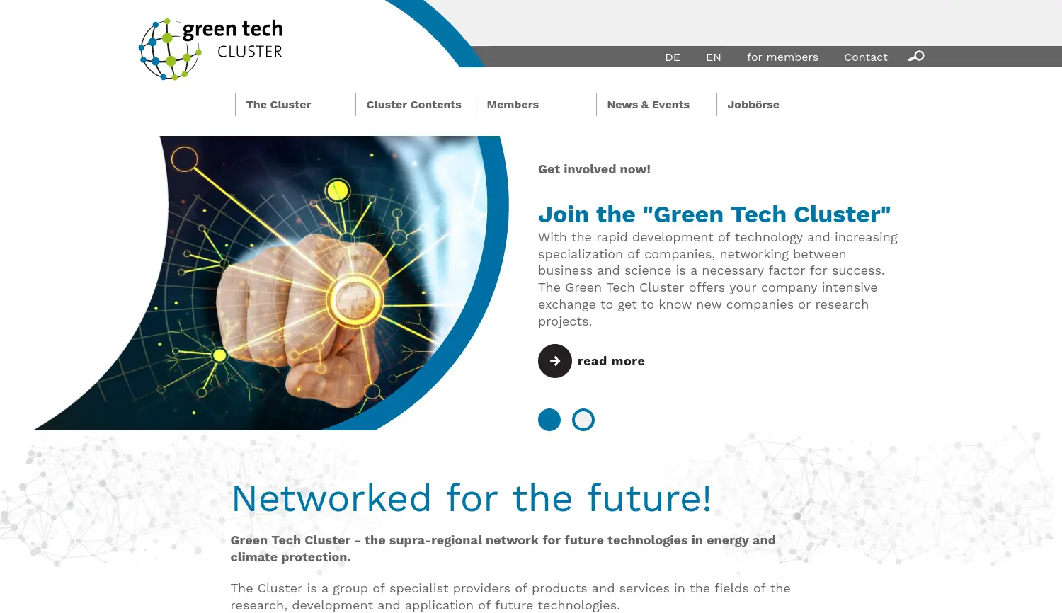 Das überregionale Netzwerk für Zukunftstechnologien in Energie und Klimaschutz. Der Green Tech Cluster ist ein überregionales Netzwerk mit Sitz in Regensburg, das Unternehmen und Forschung aus den Bereichen Energie und Klimaschutz miteinander vernetzt.