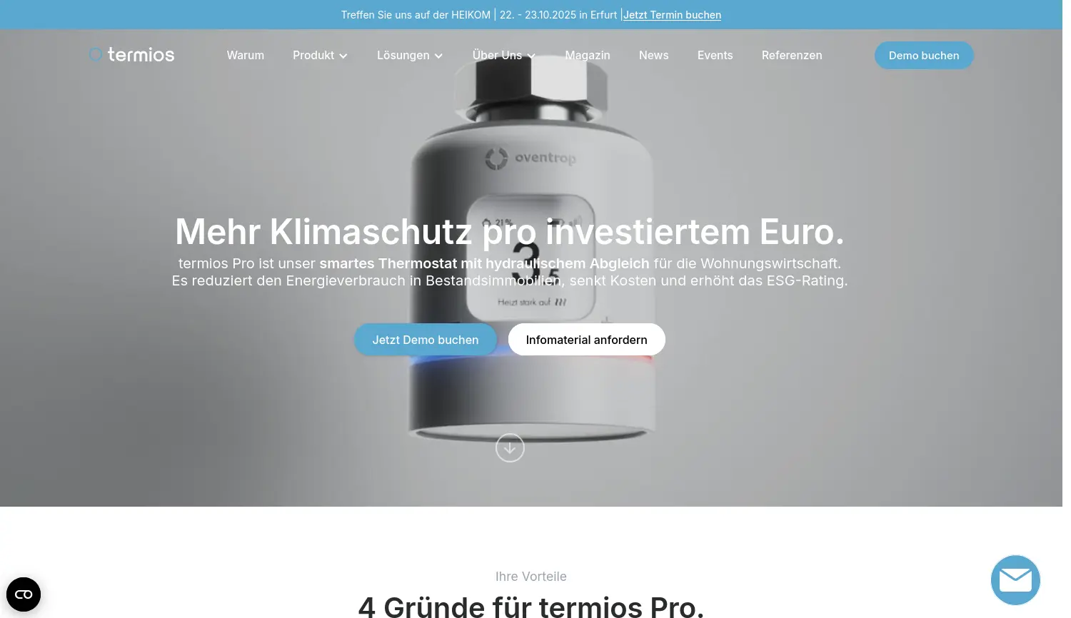 Mehr Klimaschutz pro investiertem Euro. termios Pro ist ein smartes Thermostat-System mit hydraulischem Abgleich, das den Energieverbrauch in Bestandsimmobilien der Wohnungswirtschaft effizient reduziert.