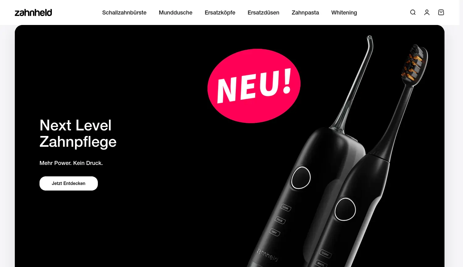 Next Level Zahnpflege. Mehr Power. Kein Druck. Zahnheld vertreibt leistungsstarke elektrische Schallzahnbürsten, Mundduschen und Naturkosmetik-Zahnpasten für eine gründliche und moderne Mundhygiene.