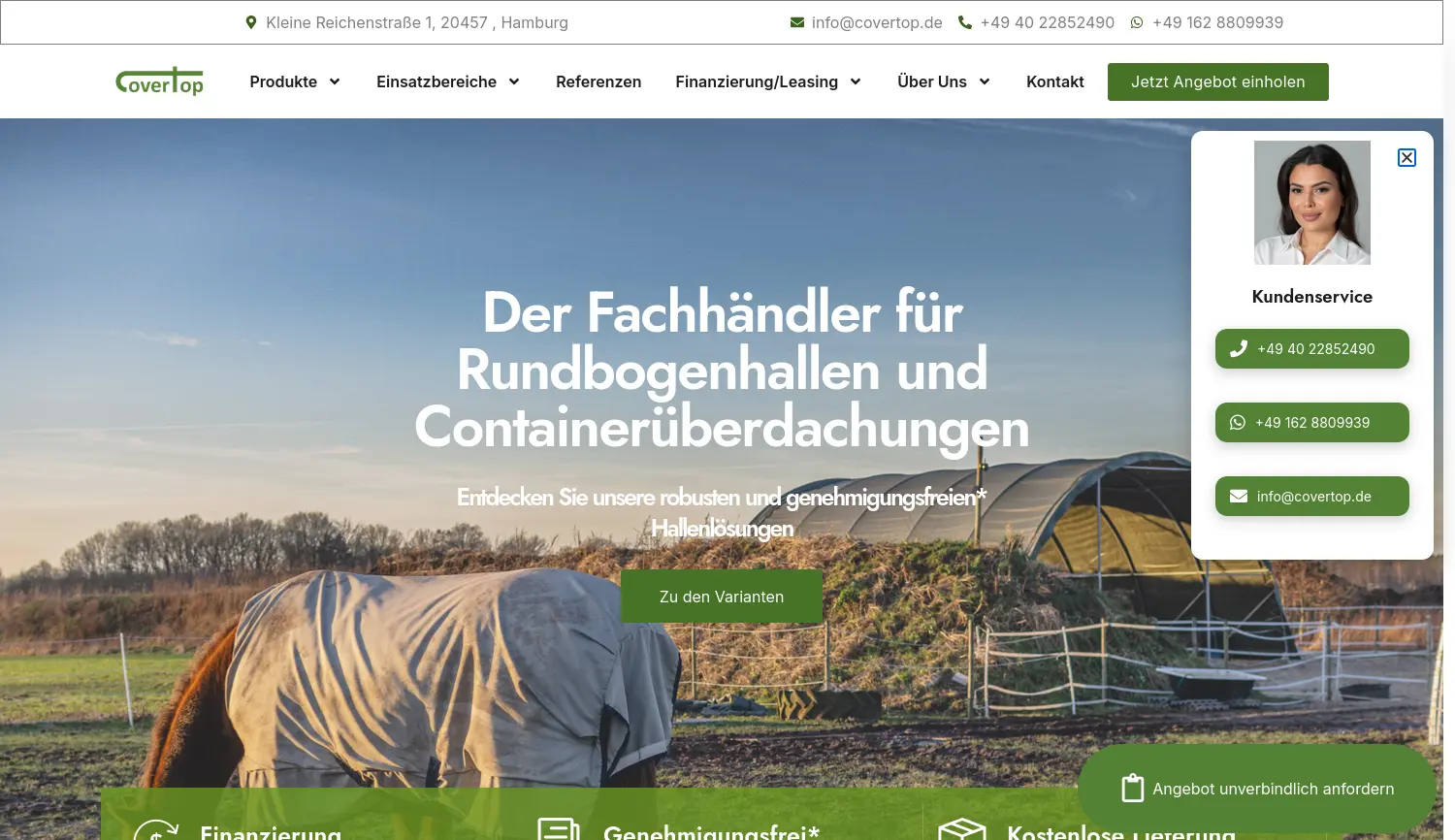 Der Fachhändler für Rundbogenhallen und Containerüberdachungen Covertop ist der Spezialist für robuste, genehmigungsfreie Fertighallenlösungen, Rundbogenhallen und Containerüberdachungen für Gewerbe und Landwirtschaft.